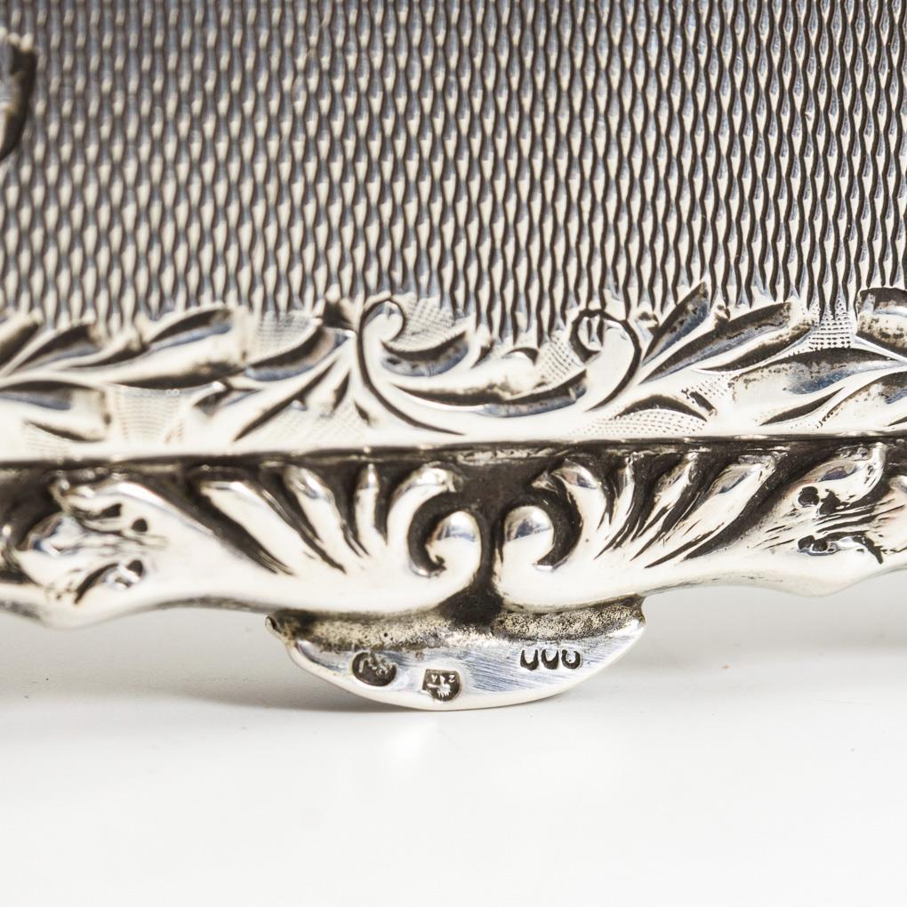 Flask or so-called pocket slide with hinged lid, silver case with engraved stave / Square powder box with floral and ribbed decoration. Inside mirror and old powder insert. Minimal signs of age.