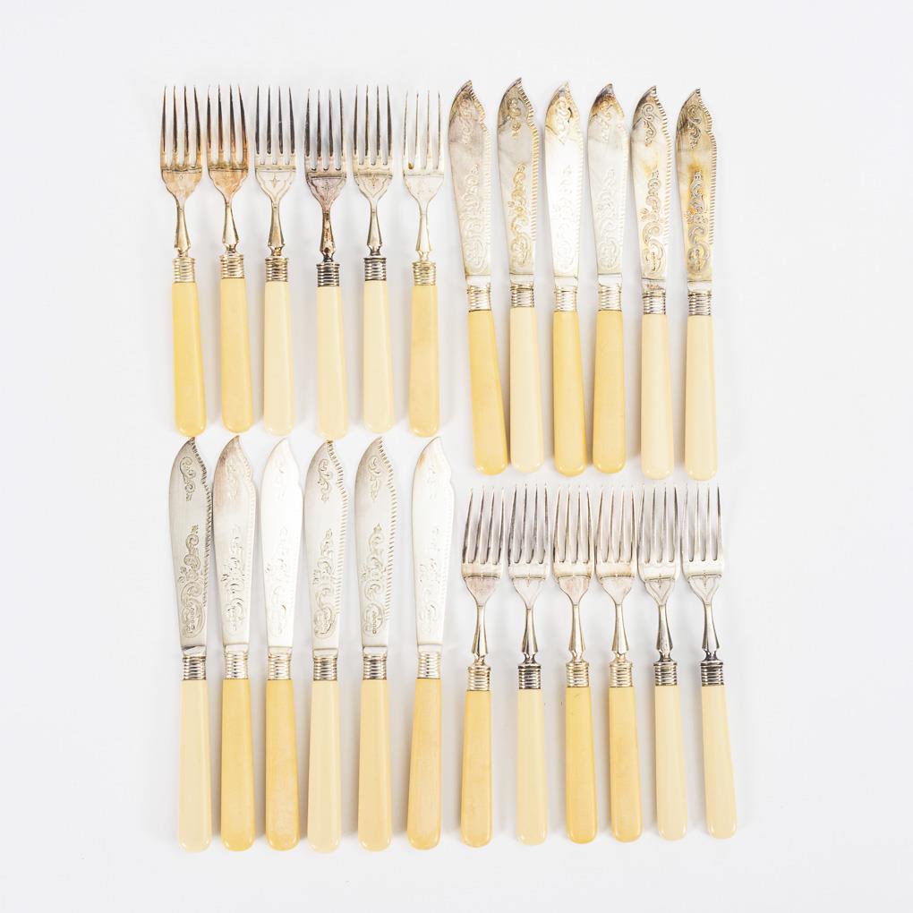 Ornamented cutlery on one side: 12 knives and forks each. Slight signs of use (only on the box).