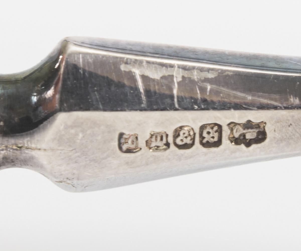 Silver-plated metal, imitation ivory, solid mahogany casket with brass inlay and monogram. Cutlery L maximum 21 cm, box 6 x 35 x 25.5 cm.