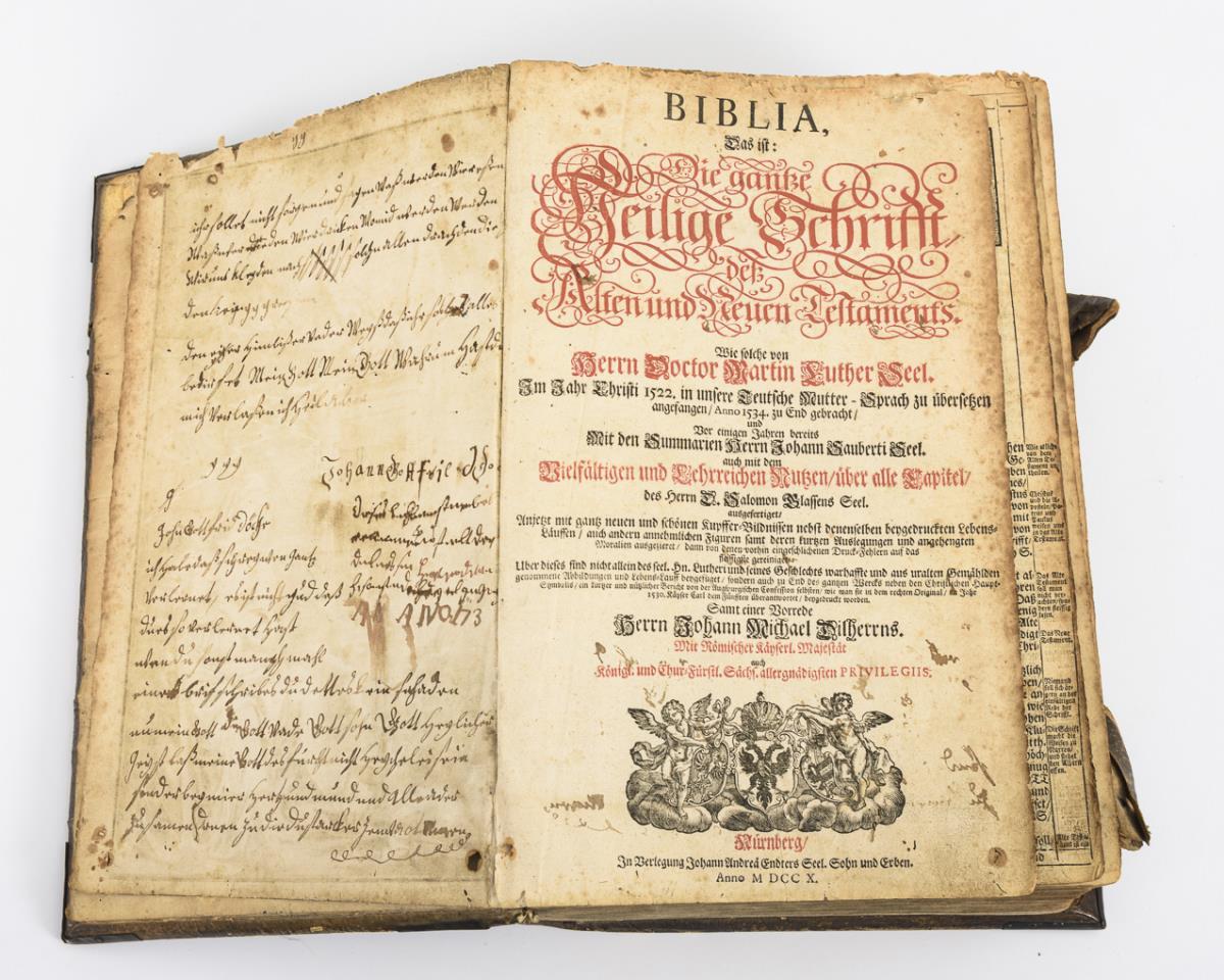 "Das ist: Die gantze Heilige Schrift, deß Alter und Neuen Testament. ... With the Summaries of Mr. Johann Saubert's Soel. also with the manifold and instructive benefit, over all chapters, of Mr. D. Salomon Glassen's Soel. completed, ... copper portraits .... decorated. Together with a preface by Johann Michael Dilherrn.
