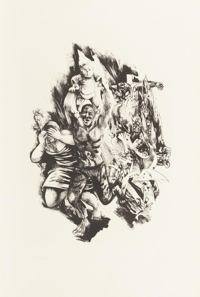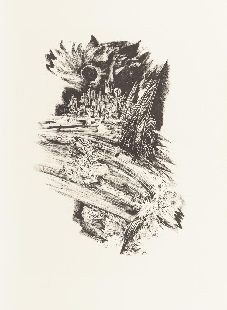 Complete, original portfolio with 11 works to the book of poems by Georg Maurer (1907 - 1971) enclosed as a fanfold, typographic title page. Folder stained.