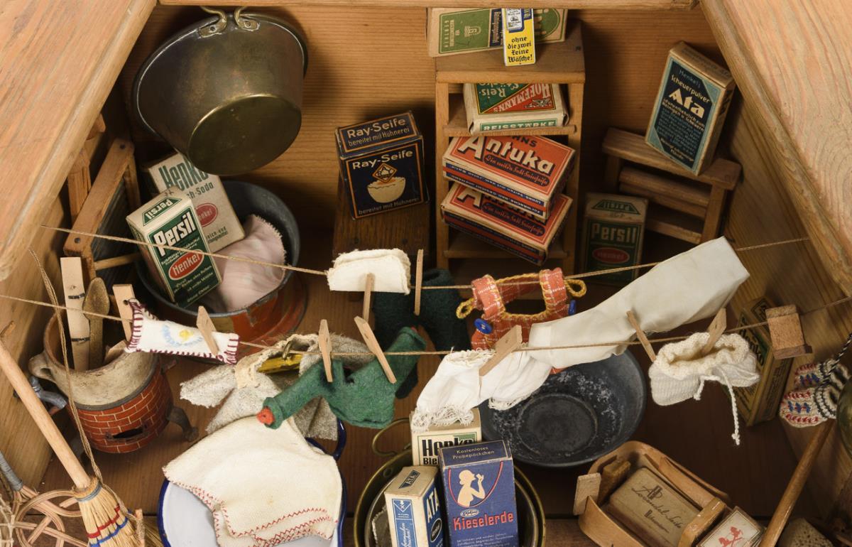Trapezoidal 1-room cabinet with small faucet. Equipped with numerous accessories, including stove, washboard, brass bowls, tin Zuber and bucket, clotheslines with laundry, carpet beater etc. Played with, partly with signs of age.