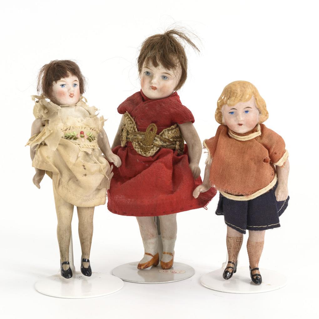 3 whole bisque dolls, 1x with modelled blonde hair, 2x with brown mohair hair. All original dressed with modelled shoes. Partly small bumps, 1x with heavily defective dress and hair.