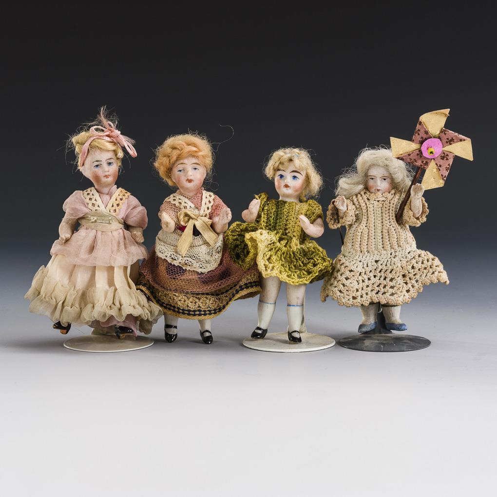 4 whole bisque dolls with painted eyes, blond mohair hair and modelled shoes. 2x with crank head and old clothes, 2x with fixed head and crochet dress. 1 foot repaired, some small bumps.