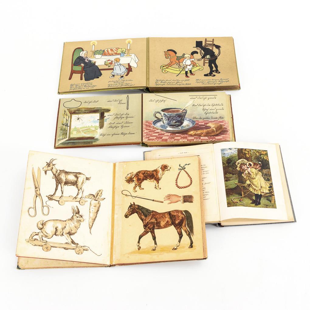 Helene Bindner: "Guck! Peek! - A picture book for our little ones", Theo. Stroefer's Kunstverlag, Nuremberg, 6th edition. 80 pages with many wood engravings and some colour lithographs. Younger rebound. / Gertrud Caspari: "Lustiges Kleinkinderbuch", with verses by Adolf Holst, Alfred Hahn Verlag, Leipzig, 22 hardcover pages. / "Büchlein 'Dies und Das'", no details. 18 hardcover pages with color lithographs. / "Das erste Buch für unser Kind", Loewes Verlag Ferdinand Carl, Stuttgart, 12 hardcover pages with color lithographs . All books for old children's books in good to acceptable condition.