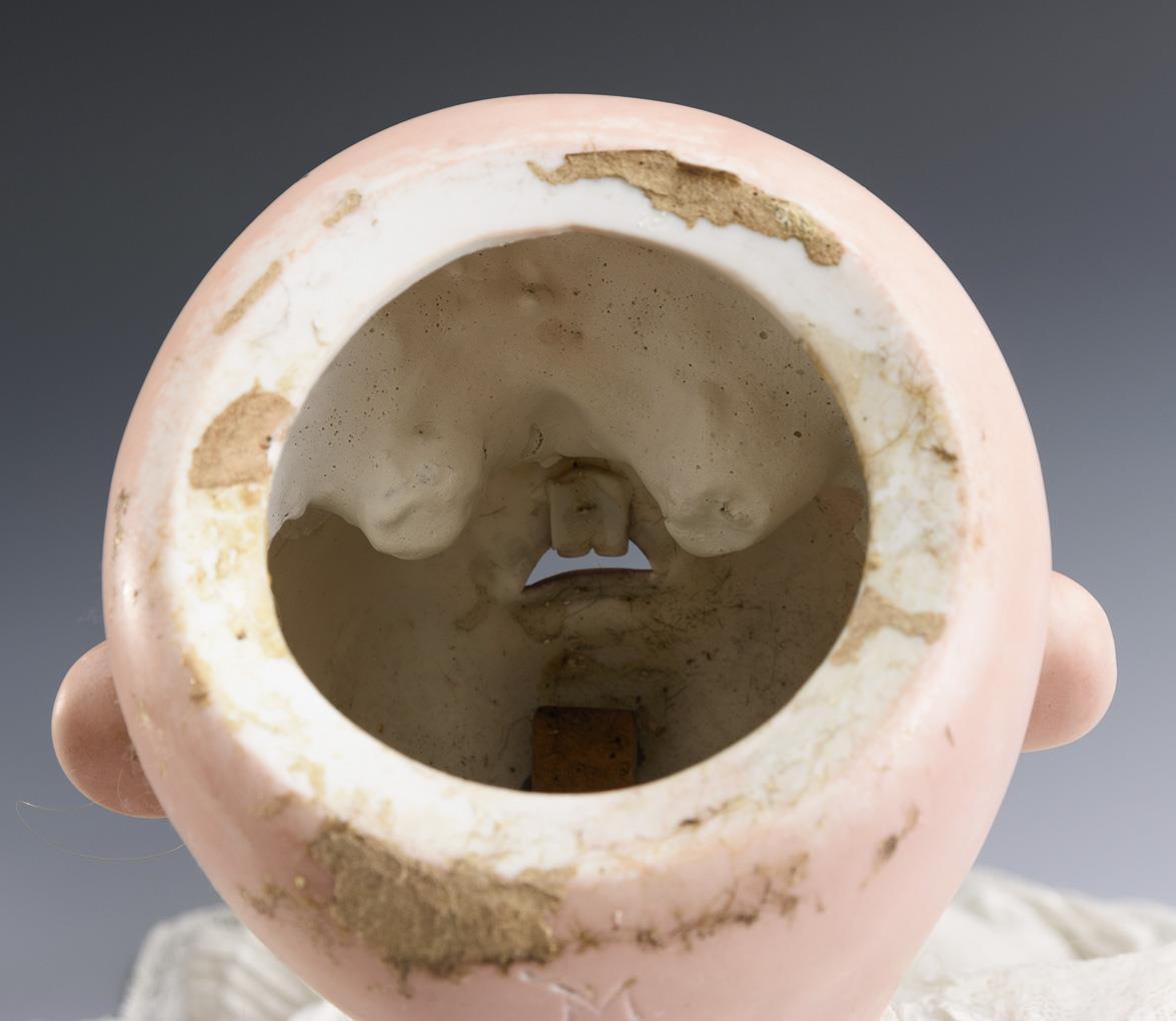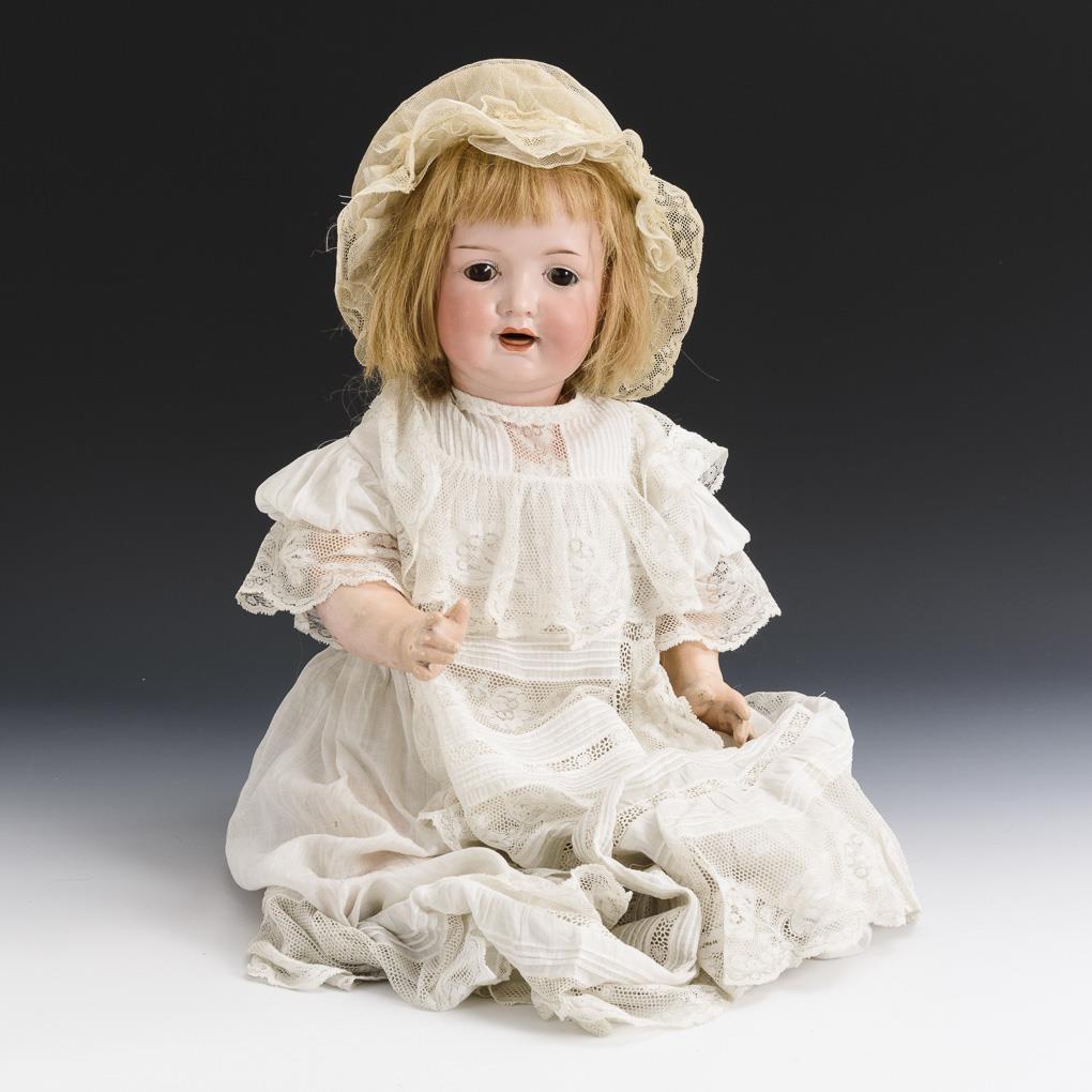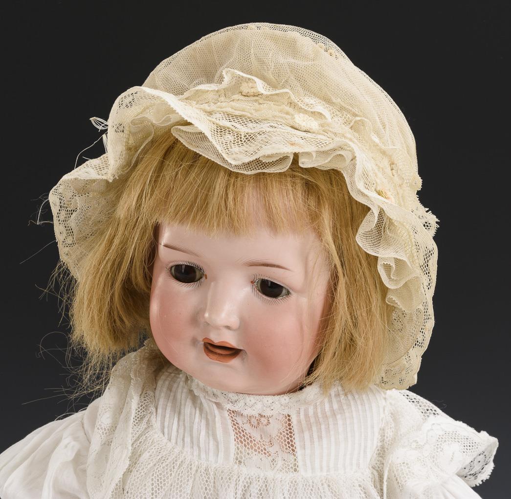 Crank head, fixed brown eyes, blonde human hair wig. 5-piece sitting baby body. Long white dress with lace, matching bonnet. Head x-rayed: without defects. Body partially painted over.