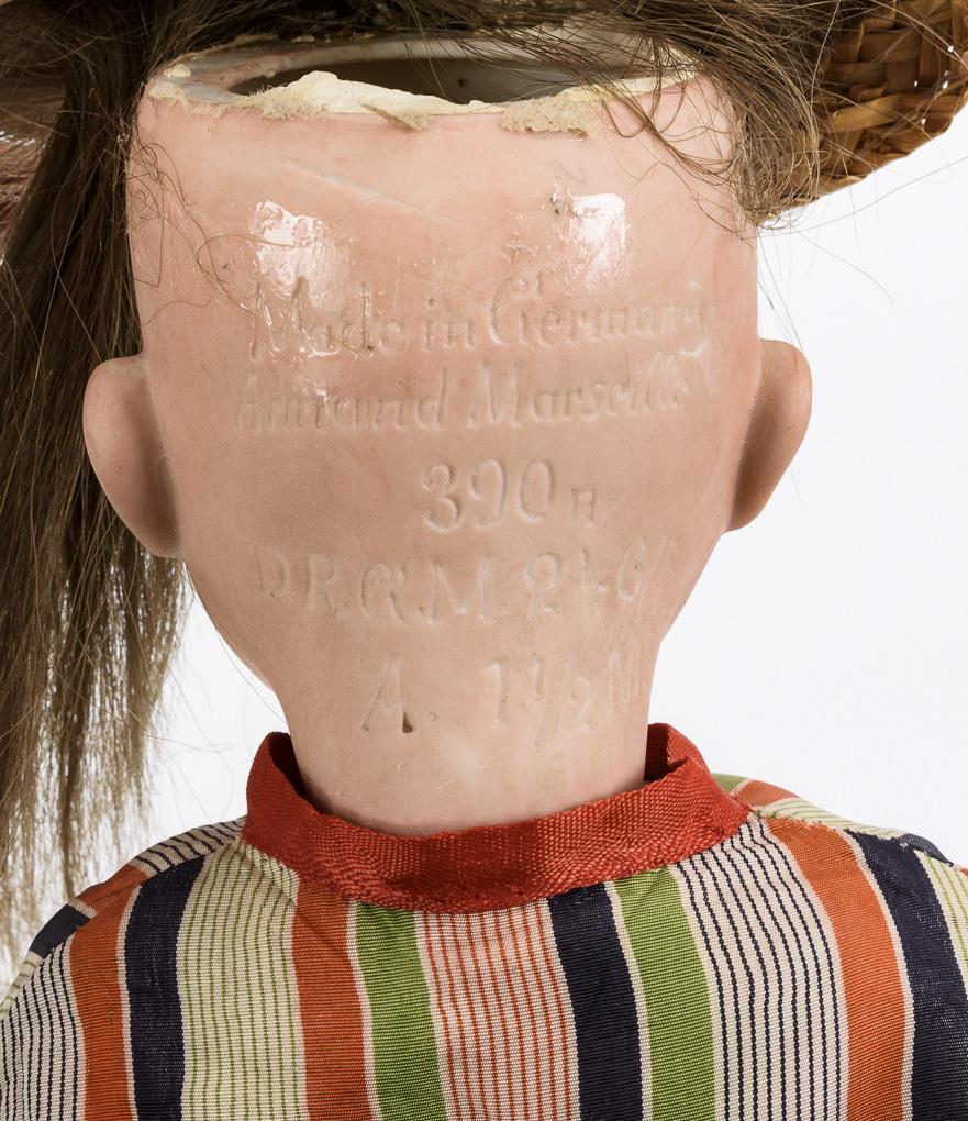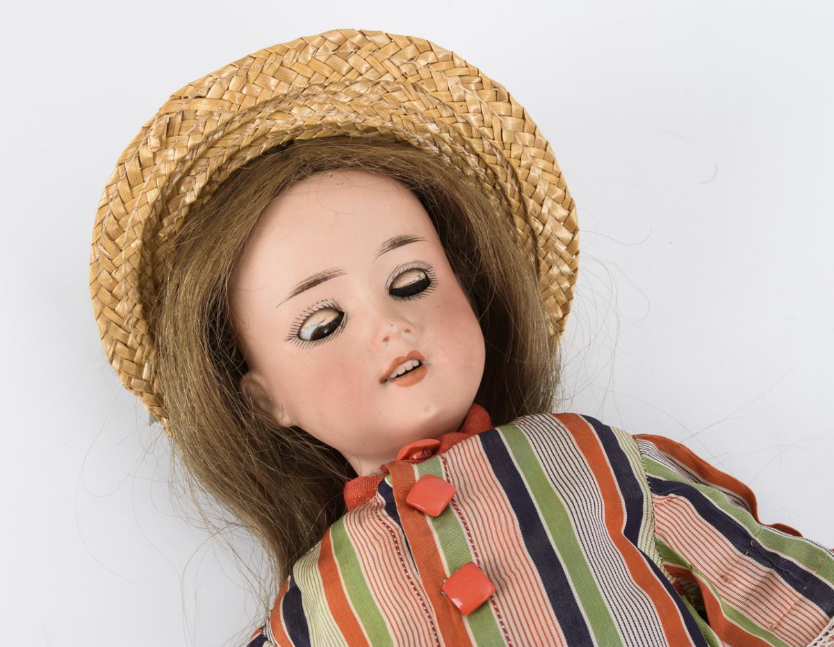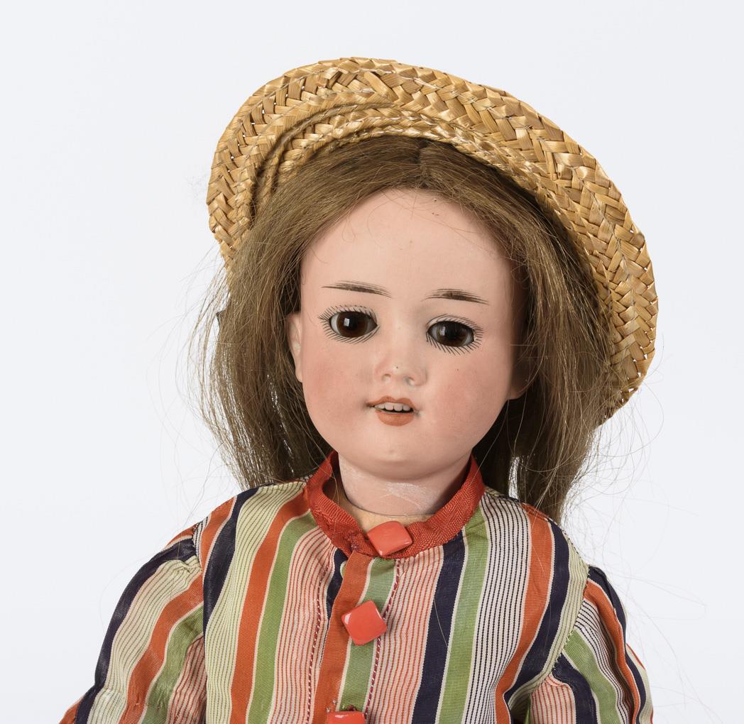 Crank head, brown sleep eyes, medium blonde long hair wig. 15-piece limb body. Striped dress, straw hat, white leather shoes, shopping net with cardboard boxes from the department store. Head x-rayed: without defects. Body partially painted over.