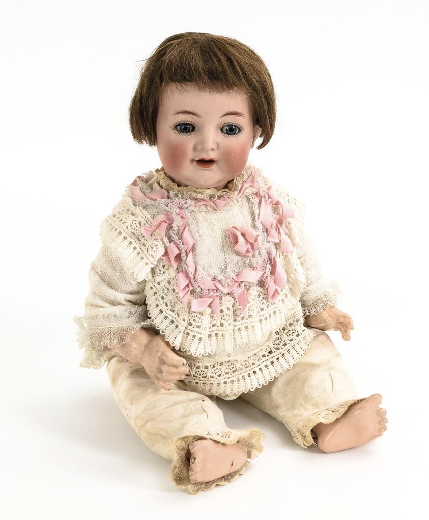Crank head, blue sleeping eyes, movable tongue, brown human hair wig. 5-piece sitting baby body with 2-piece torso and soft voice, stamped "Made in Germany" in red. White clothing. Minor hairline cracking behind the ears, left lid with small missing part.