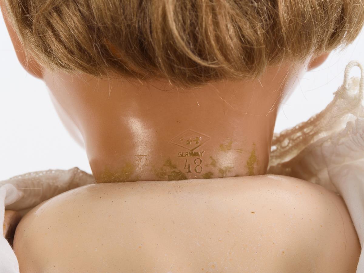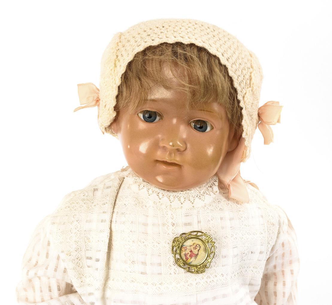 Crank head, blue sleeping eyes, eyelashes, glued blond mohair wig. 5-piece standing doll body made of mass. White dress, red knitted shoes, crocheted hat. Face somewhat faded, neck crank rubbed.