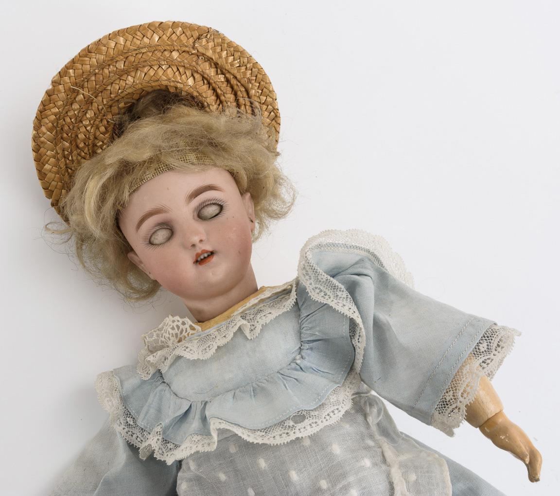 Crank head, blue sleep eyes, blonde mohair wig. 13-piece jointed body. Light blue dress, straw hat, handbag, brown leather shoes. Head x-rayed: without defects, only small production defect on the left ear. Body with small defects, repair marks at the base of the neck.