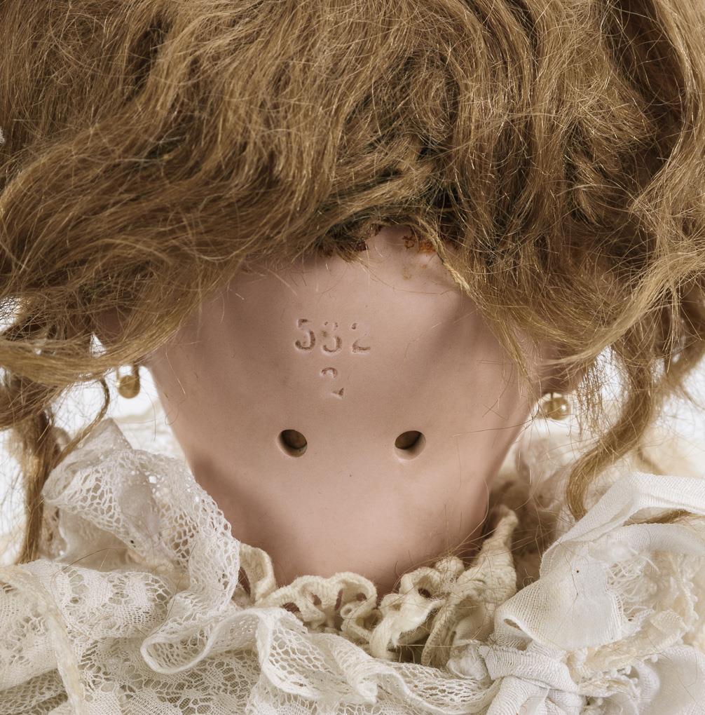 Crank head, fixed blue eyes, earrings, pinned medium blonde mohair wig. 11-piece articulated body with tubular thighs. White dress with pink bows. Head not x-rayed. Small chip at right ear hole and eye cutout. Body with slight paint defects, 1 thumb bumped.