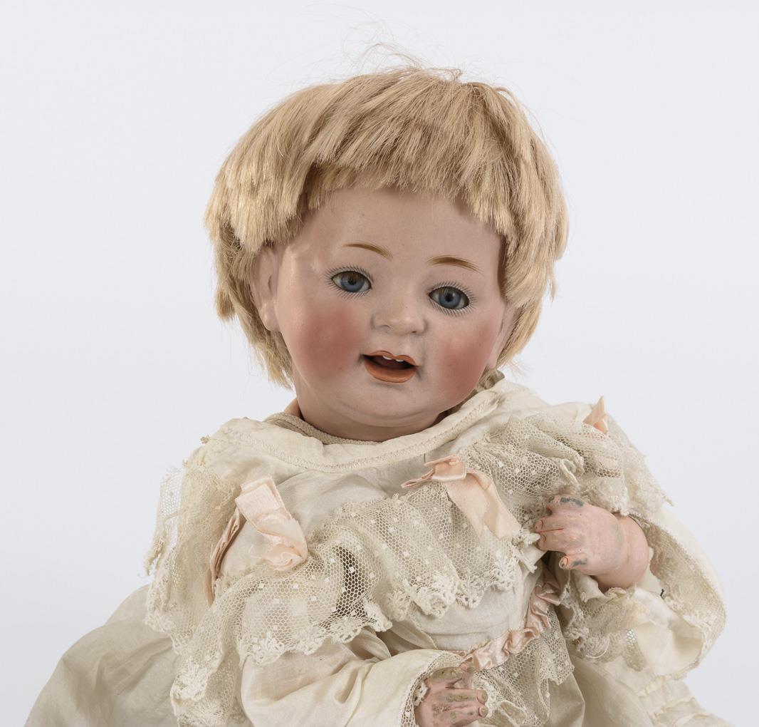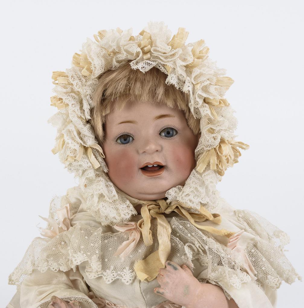 Crank head, blue sleeping eyes, eyelashes, blonde synthetic hair wig. 5-piece sitting baby body. White dress, matching lace bonnet. Firmly plastered head cover: not x-rayed, but no defects visible. Body with minimal paint wear.
