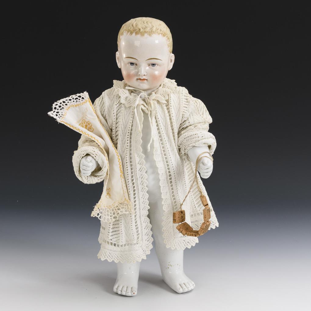 Nude frog or so-called "Frozen Charlotte" with pink tinted face, painted blue eyes and modelled blonde hair. White crochet coat. For good measure, towel and buoyancy aid made of cork.