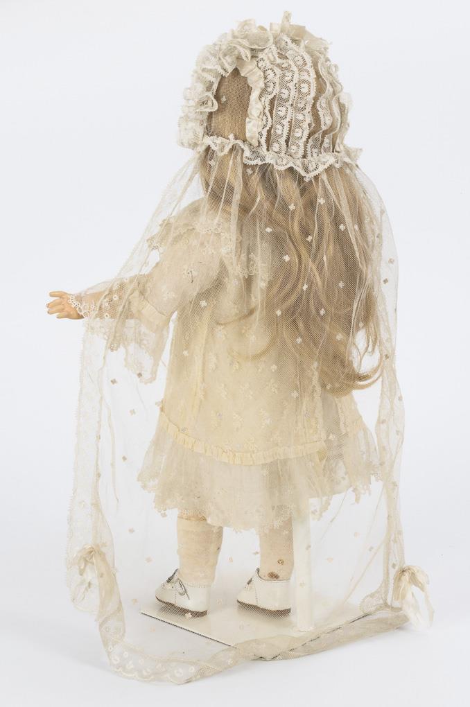Crank head, blue sleeping eyes, long blonde human hair wig, pierced ears. 15-piece limb body. White lace dress, long matching veil. Fire crack behind left ear, tiny chips at ear holes. Fingertips retouched.