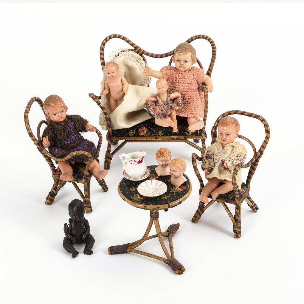 Seat bench, 2 chairs and round table, each black cover with floral pattern. In addition 6 dolls, 2 breast heads and 3 parts doll's house porcelain. Dolls with partly strong defects.