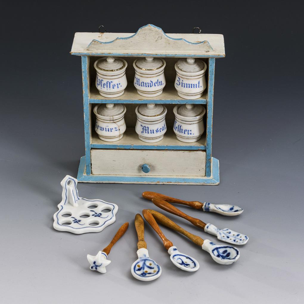 White lacquered wall shelf with blue edges, in it 1 drawer and 6 spice jars. / Wall bracket with 5 spoons and whisk. Traces of age, spice jars with defects.