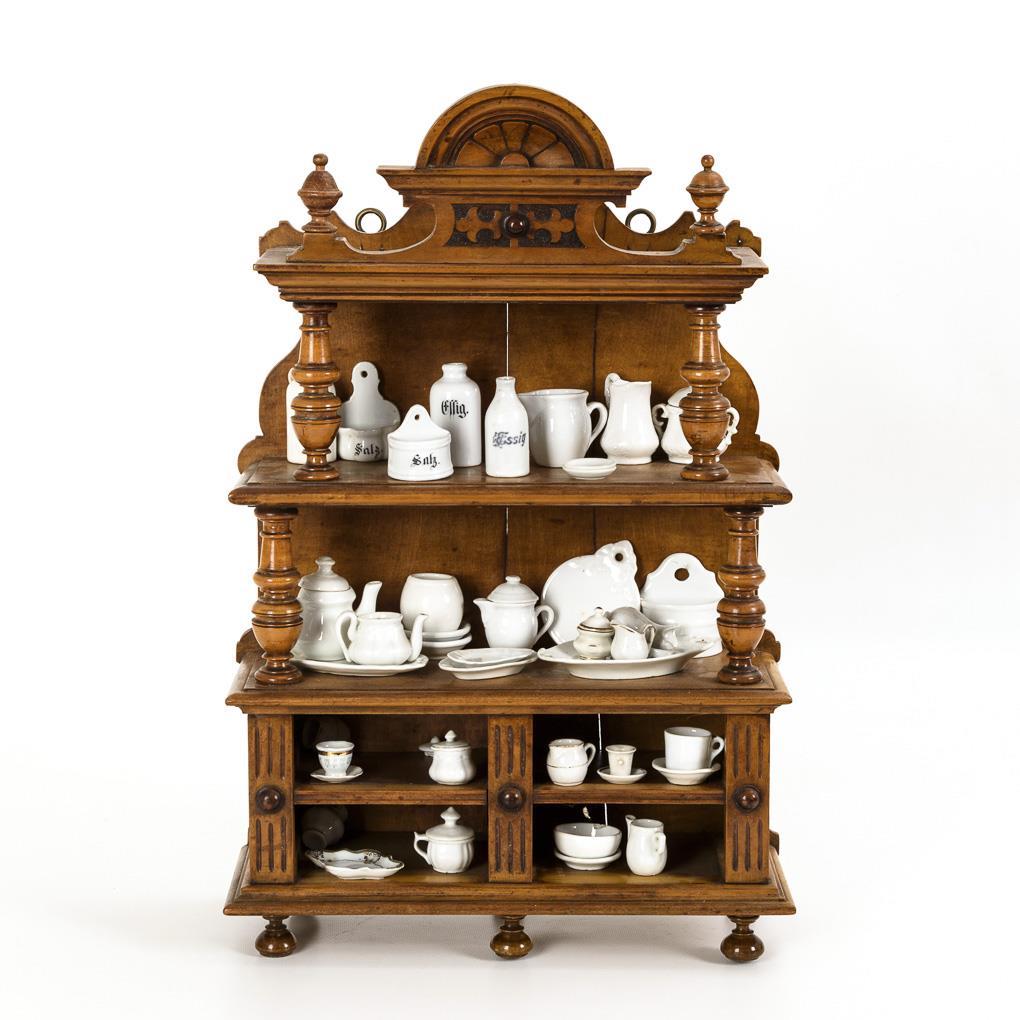 Founder period shelf with doll's house porcelain dishes.