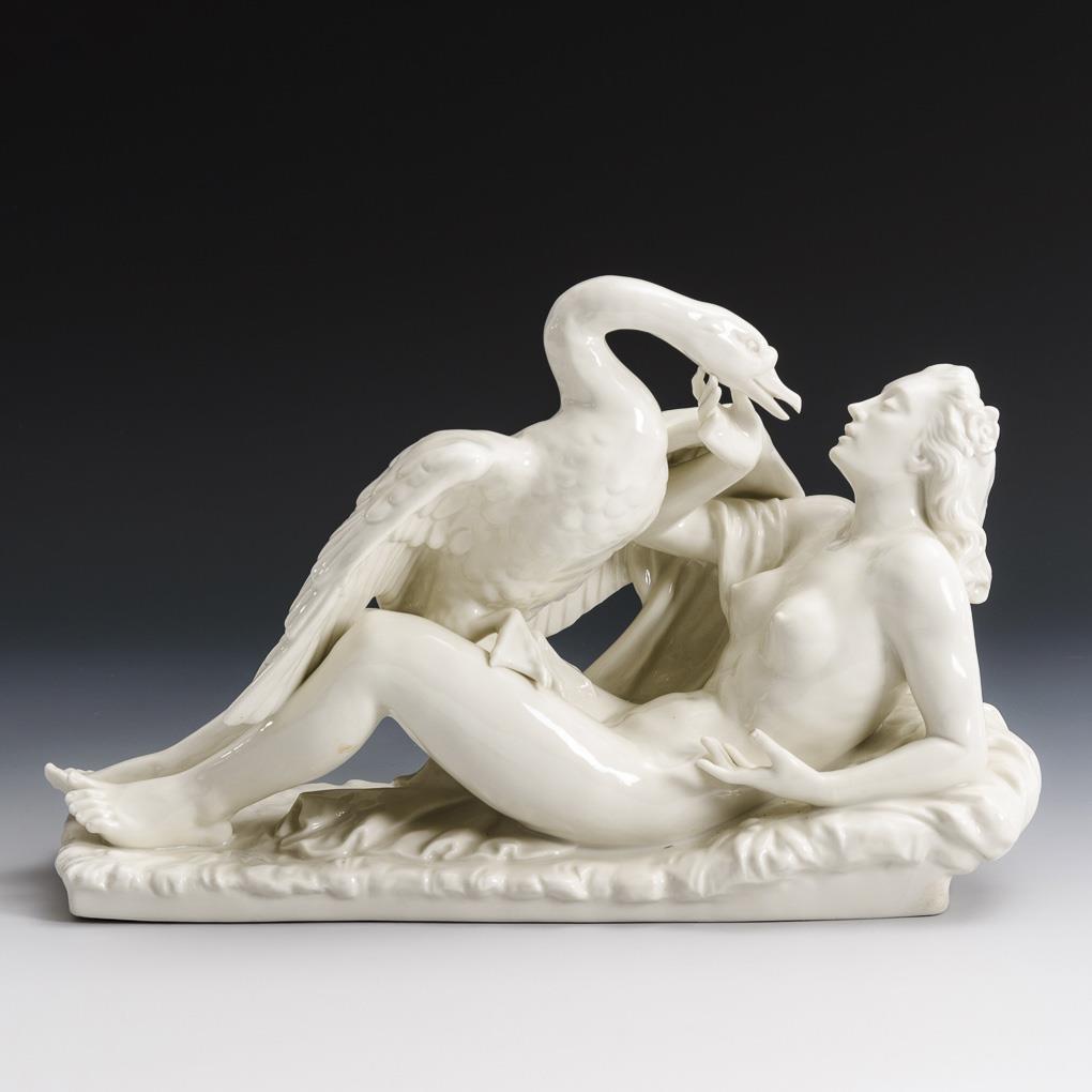A female nude. Restoration to the right leg, reclining on a grass pedestal, caressing a swan.