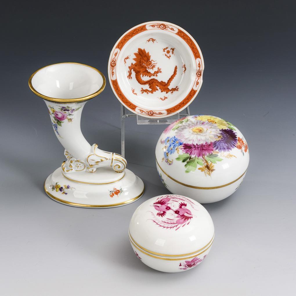 Cornucopia vase with floral painting (h 12 cm), 2 jars (1x with floral painting, 1x with purple dragon painting; h 5 and 6,5 cm) and ashtray with red dragon painting ( Ø 9,5 cm).