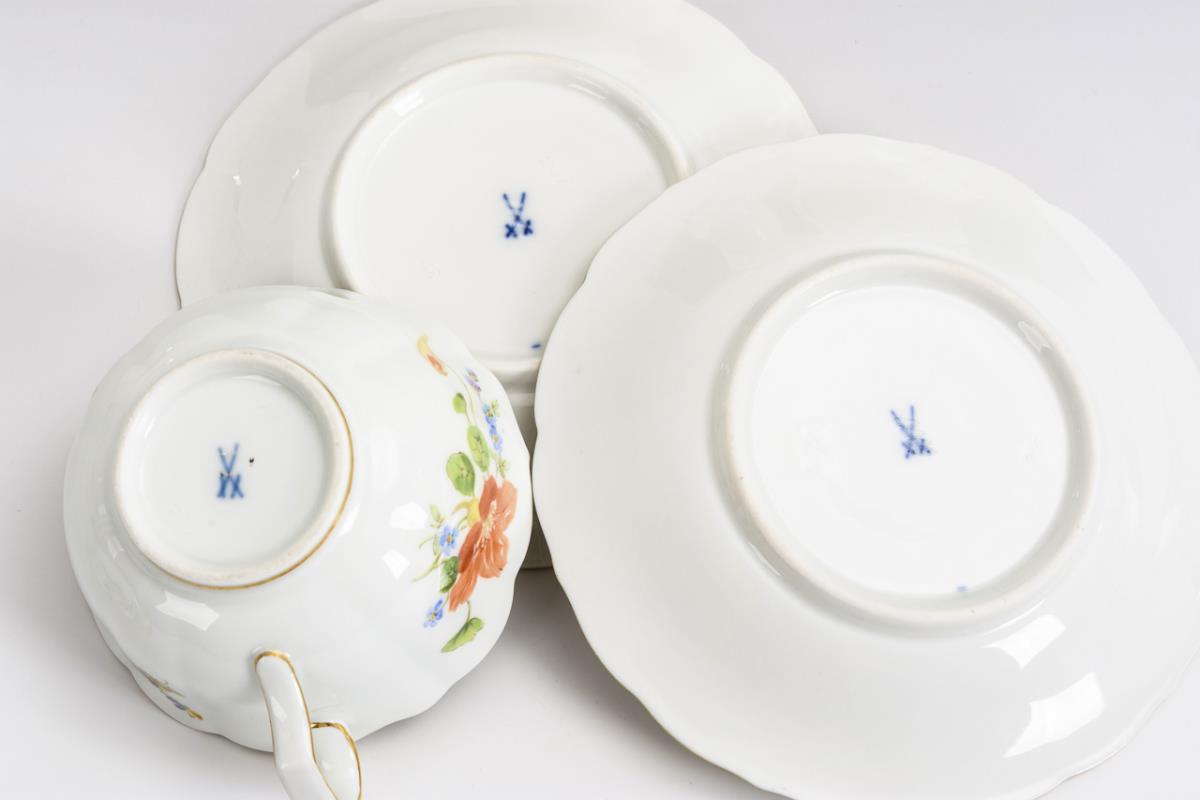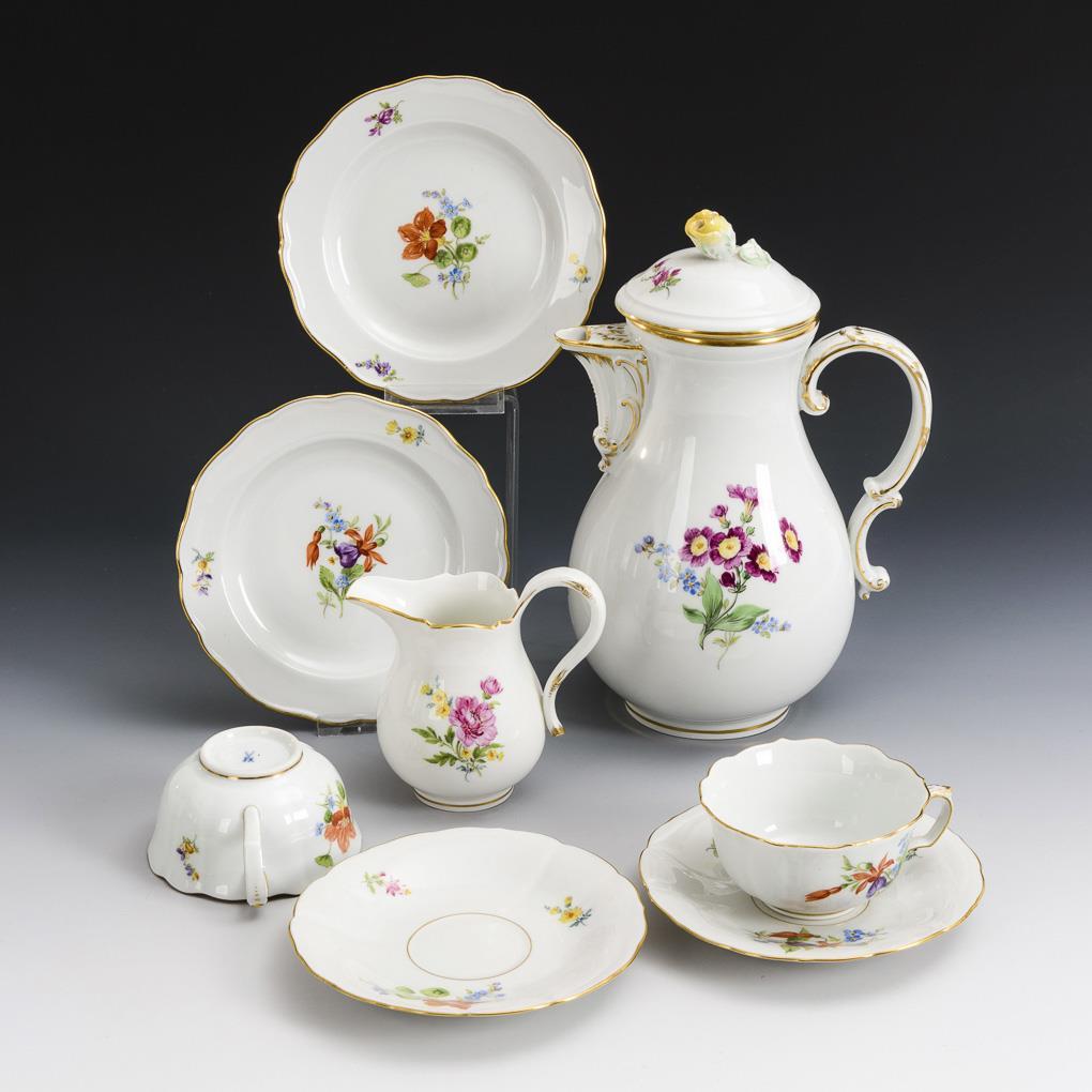 Form "New Cutout". Coffee pot (h 25,5 cm), milk jug, 2 tea cups, 2 saucers and 2 pastry plates. Bump on rose knob, hairline crack in milk jug.