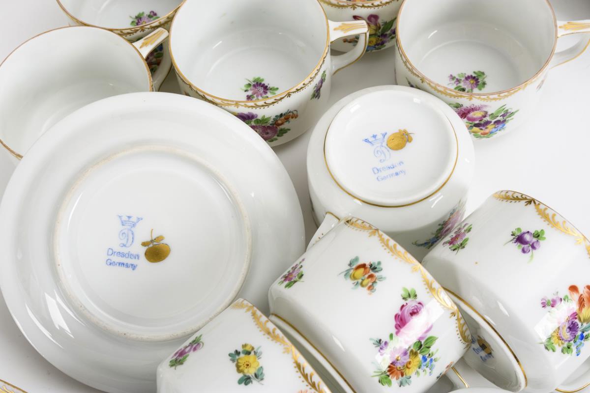 43 + 1 pieces. Coffee pot (H 23.5 cm), creamer, sugar bowl, bonbonnière, 12 cups, 11 saucers, 12 cake plates, 2 breakthrough bowls (L 12.5 and 23.5 cm), 1 credenza plate (Ø 28 cm) and 1 coaster (Ø 17 cm). As an addition the book: Sonntag, Hans, Helena Wolfsohn & Co. Chronicle of a Jewish merchant family in Dresden, Dresden 2016, 163 pages, some illustrations. Upper handle attachment of the coffee pot restored.