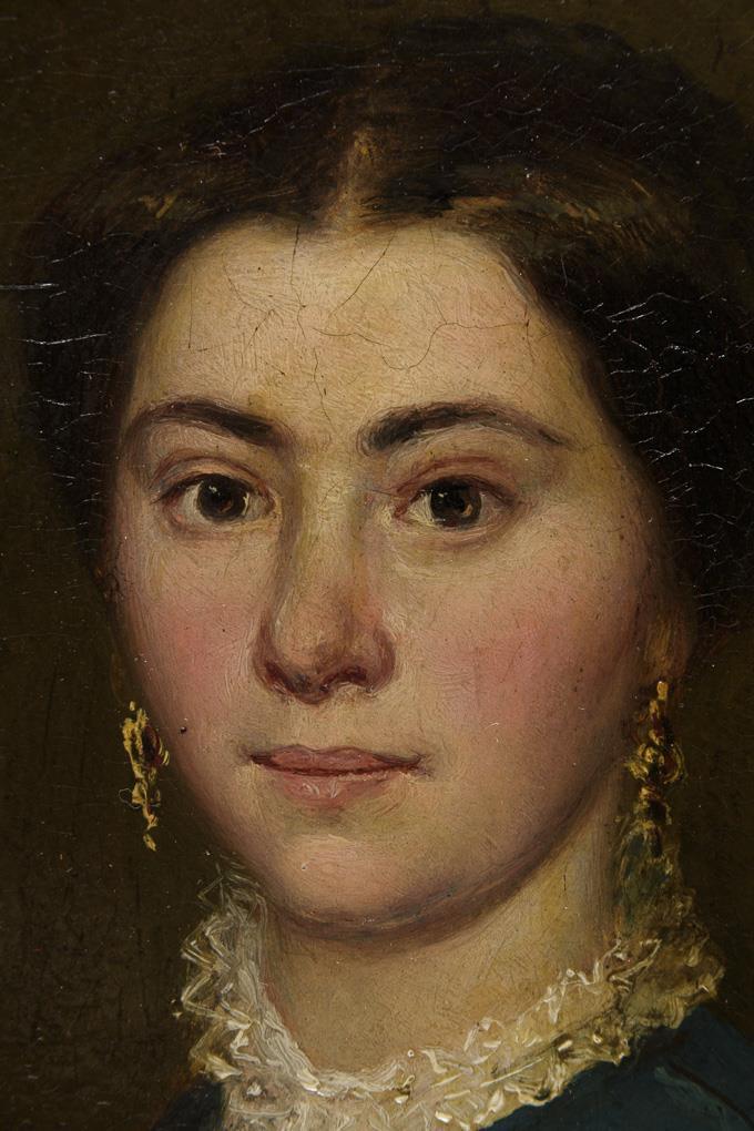 Each portrait of a young woman in blue or old pink dress. Counterparts are lots (1429) and (1430). The sitters belong to the same family. Traces of age.