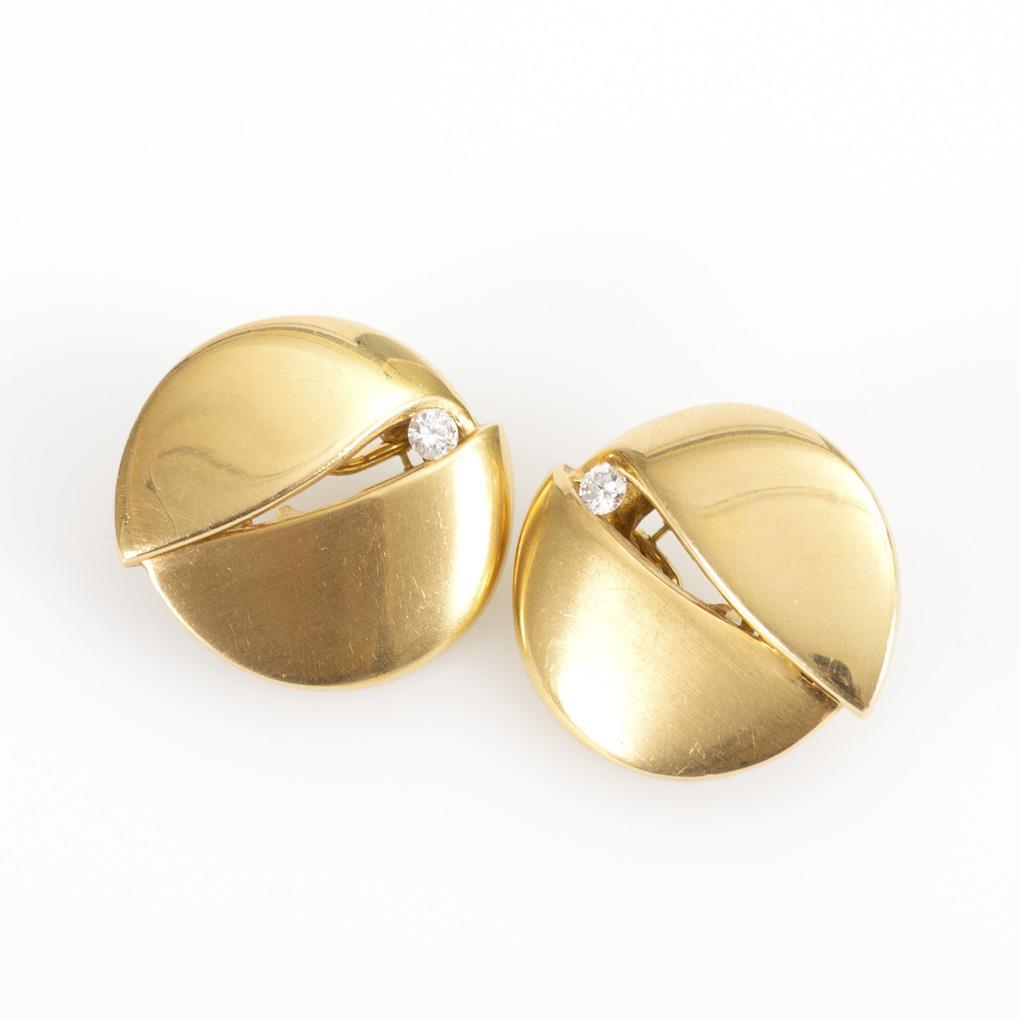 Stamped yellow gold 750. Hallmark uninterpreted. Diamonds 0.12 ct. each. Ø 2.5 cm. 17,6 g.