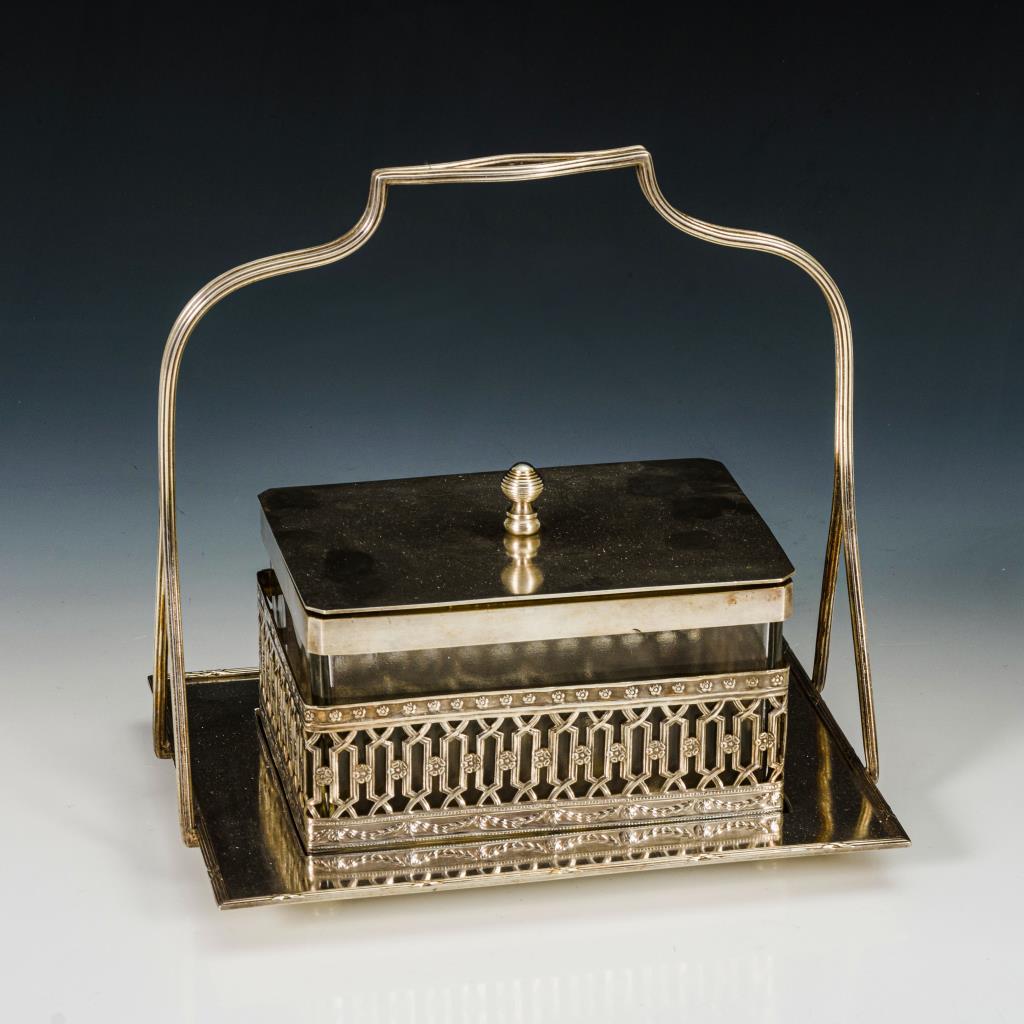 Rechteckige Keksdose mit Bügelhenkel und flachem Deckel. Gebrauchsspuren, kleine Dellen, Glas mit 2 Randchips.