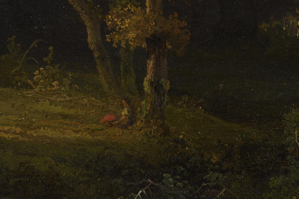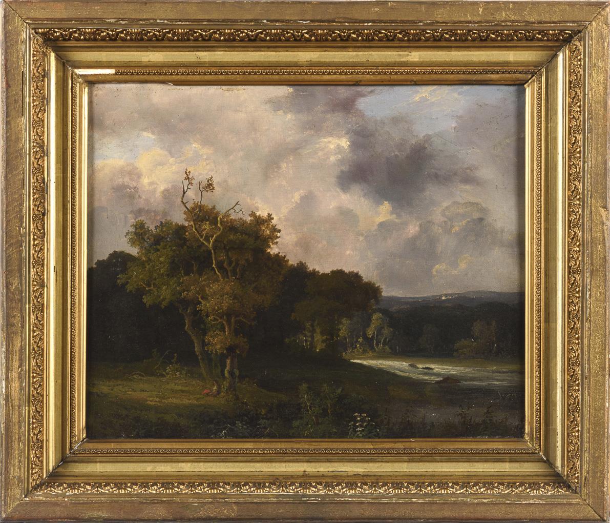 Edge of a forest with staffage figure under a tree near a river with view into the wide mountainous region under cloudy sky. Light traces of age.