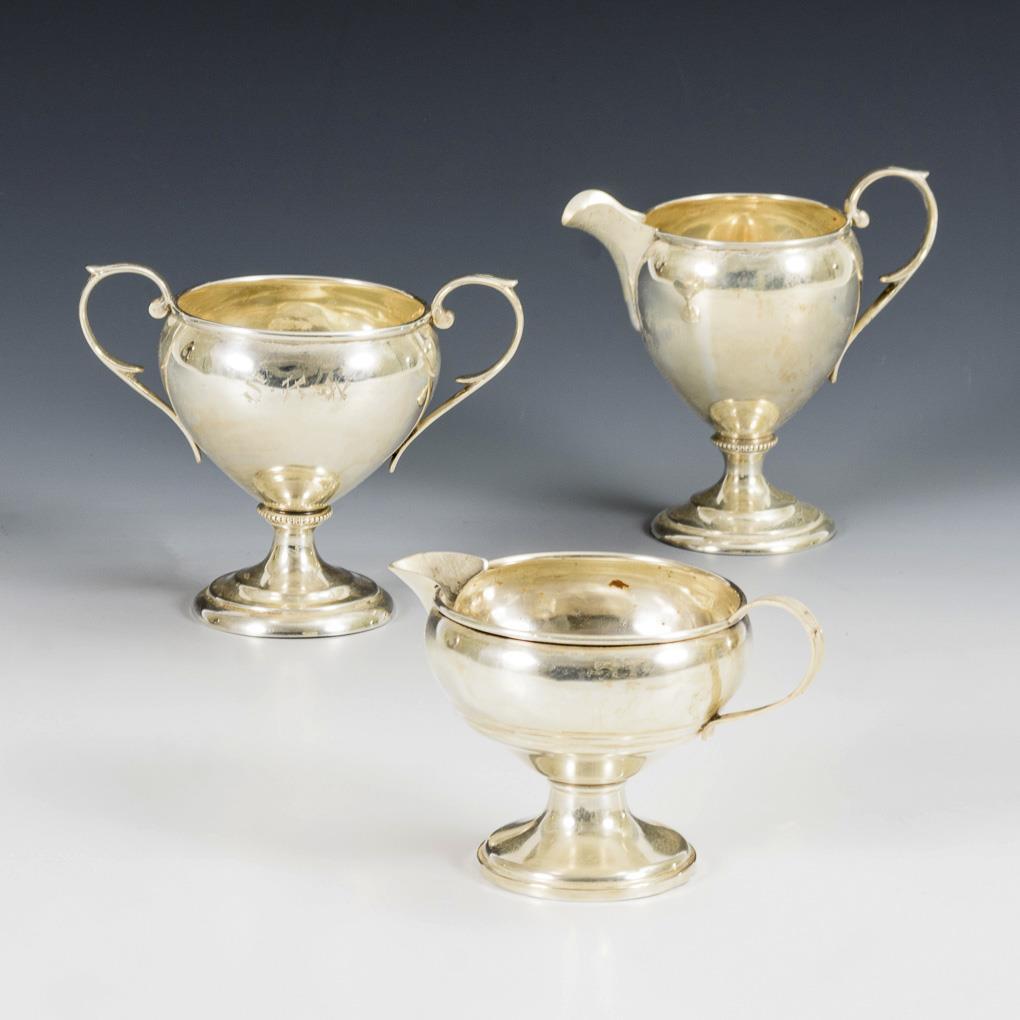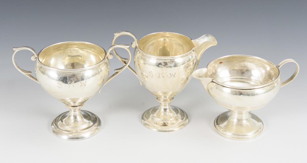 Sugar bowl and cream pourer with monogram engraving "S.K.W.", plus similar cream pourer with weighted foot. Signs of use, dents.