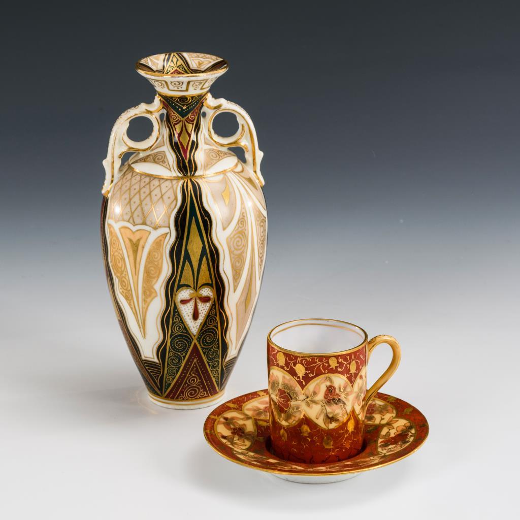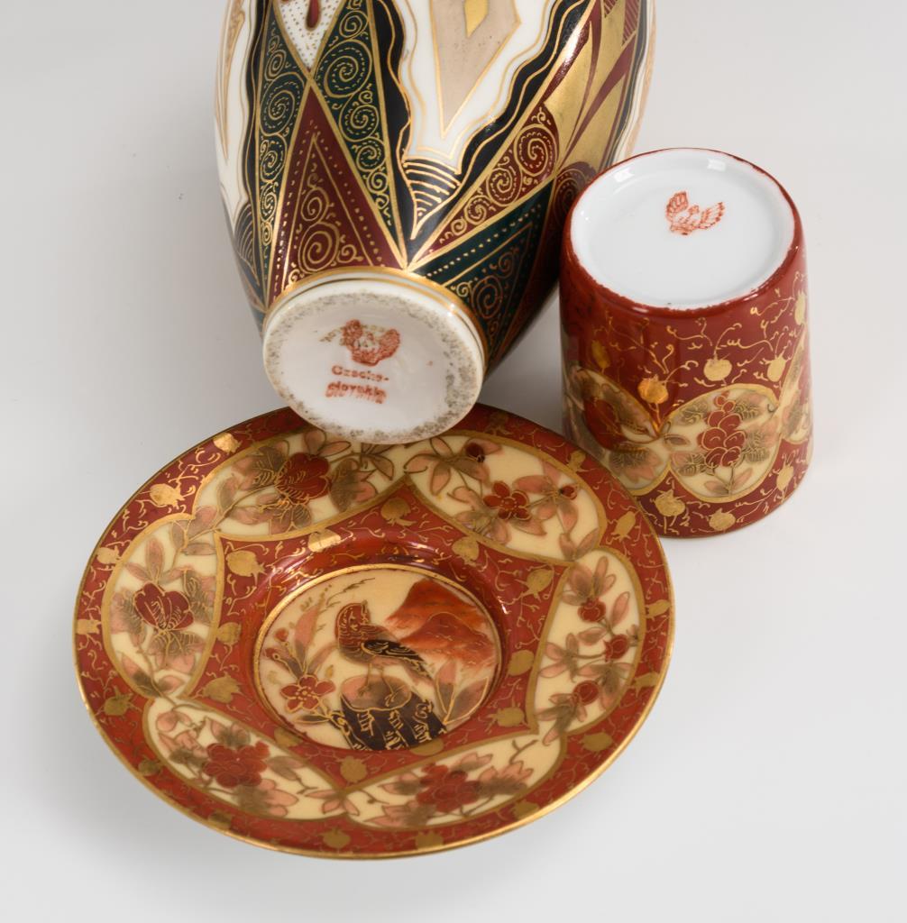 Balustervase mit zwei Henkeln und ornamentaler Malerei (H 15,5 cm). / Zylindertasse (H 5,5 cm) mit originaler Untertasse (Ø 9,5 cm), rotem Teilfond und floraler Malerei. Partiell minimaler Goldabrieb.