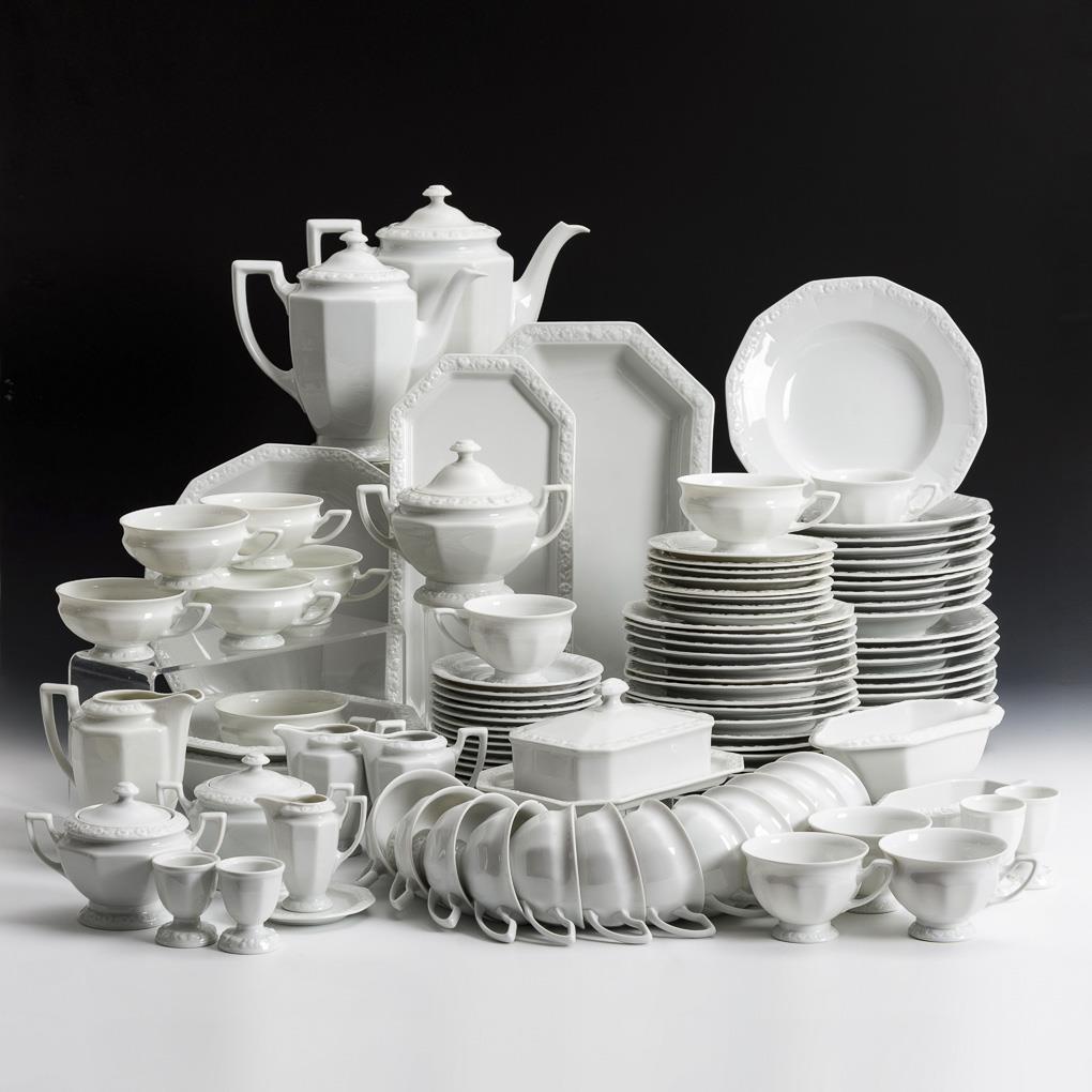 107 pieces. 2 coffee pots (H 24 and 20,5 cm), 2 + 1 sugar bowls, 1 + 2 +1 milk jugs, 17 coffee cups, 4 + 3 tea cups, 17 + 8 saucers, 2 + 2 egg cups, 16 breakfast plates, 10 soup plates, 10 dinner plates, 2 bowls (Ø 25 cm), 2 platters (L 36 and 38,5 cm), 1 round plate (Ø 28,5 cm), 1 butter dish, 1 + 1 sauce boats and 1 small plate (Ø 11 cm). Chip on 1 Untertellerr- and 1 food plate edge, 1 cup edge bumped.