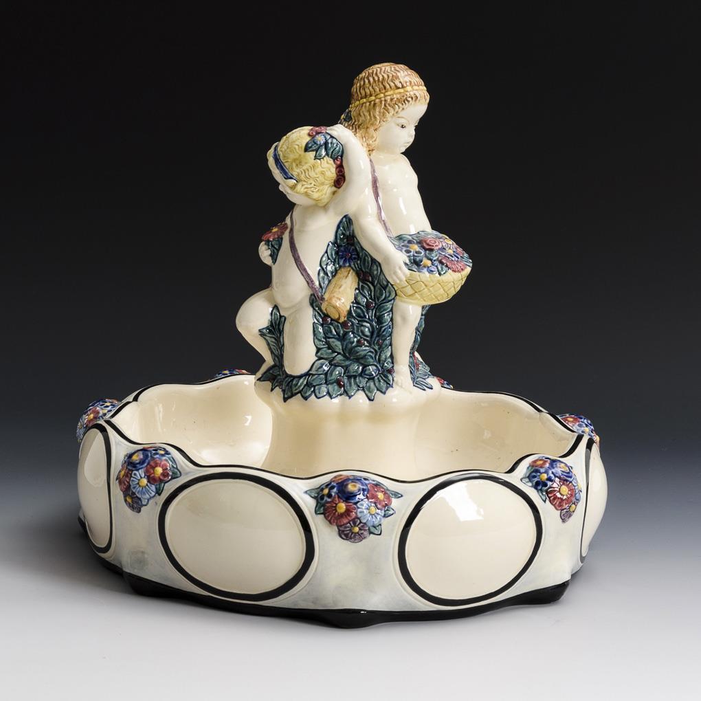 Large art nouveau fruit bowl with 3 girls. Karlsruhe majolica.