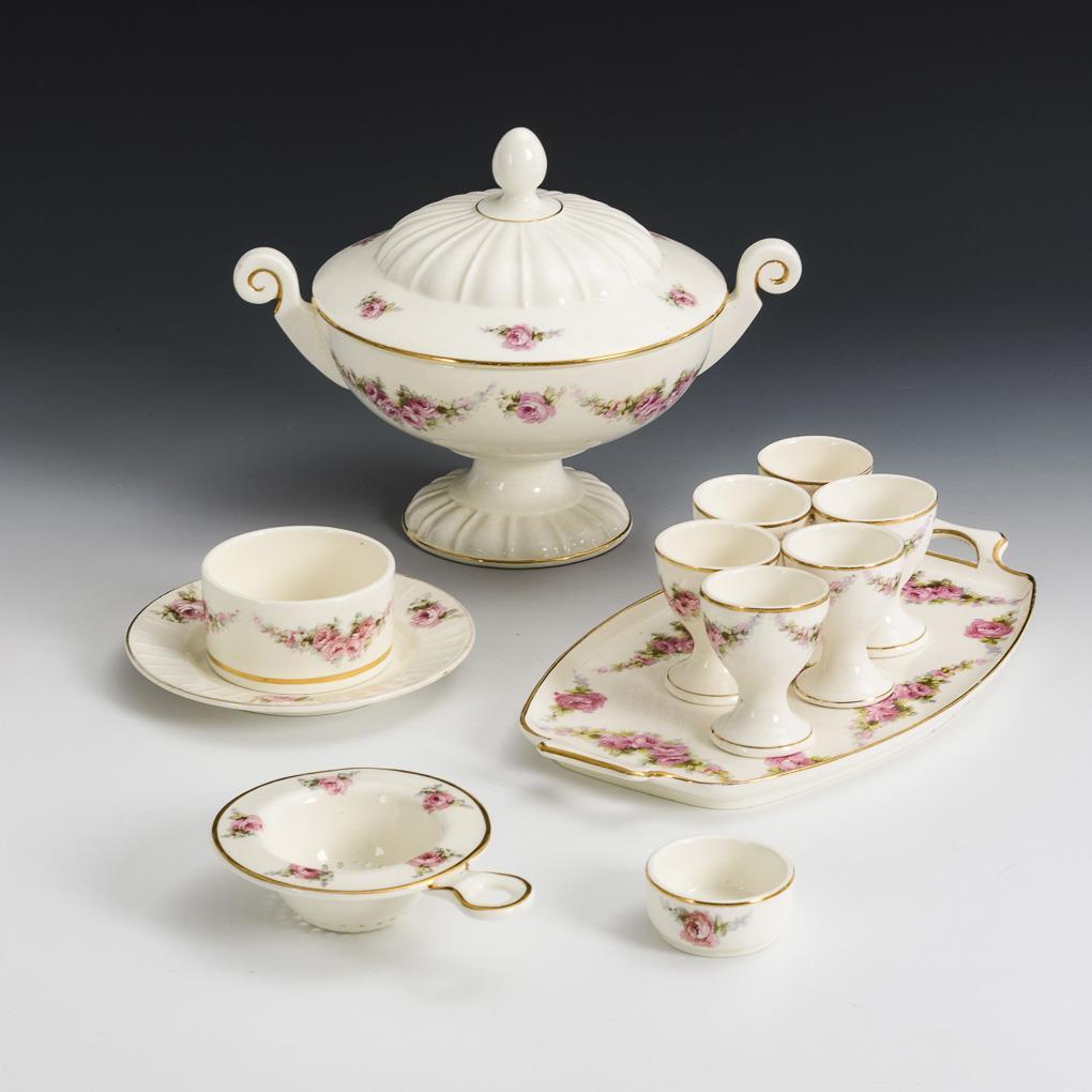12 pieces. Round footed bowl with voluted handles and lid (h 18 cm), tray (l 26 cm), 6 egg cups (h 6 cm), saucer (Ø 13 cm), small bowl (Ø 5 cm) and tea strainer with bowl (Ø 9,5 cm). Slight signs of age and use, partially minimal defects.