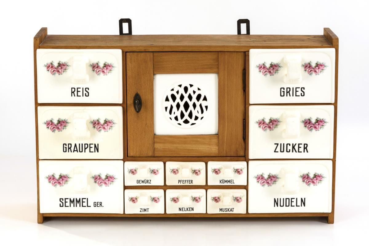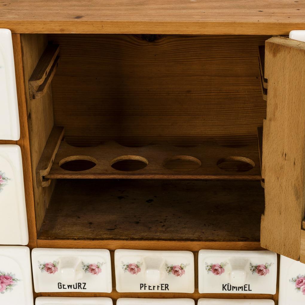 Small beech wall cupboard with 12 marked drawers and a 1-door central compartment with inner holder, 1 key (lock defective). Light signs of age, 1 drawer restored, partially hair cracked and slightly bumped.