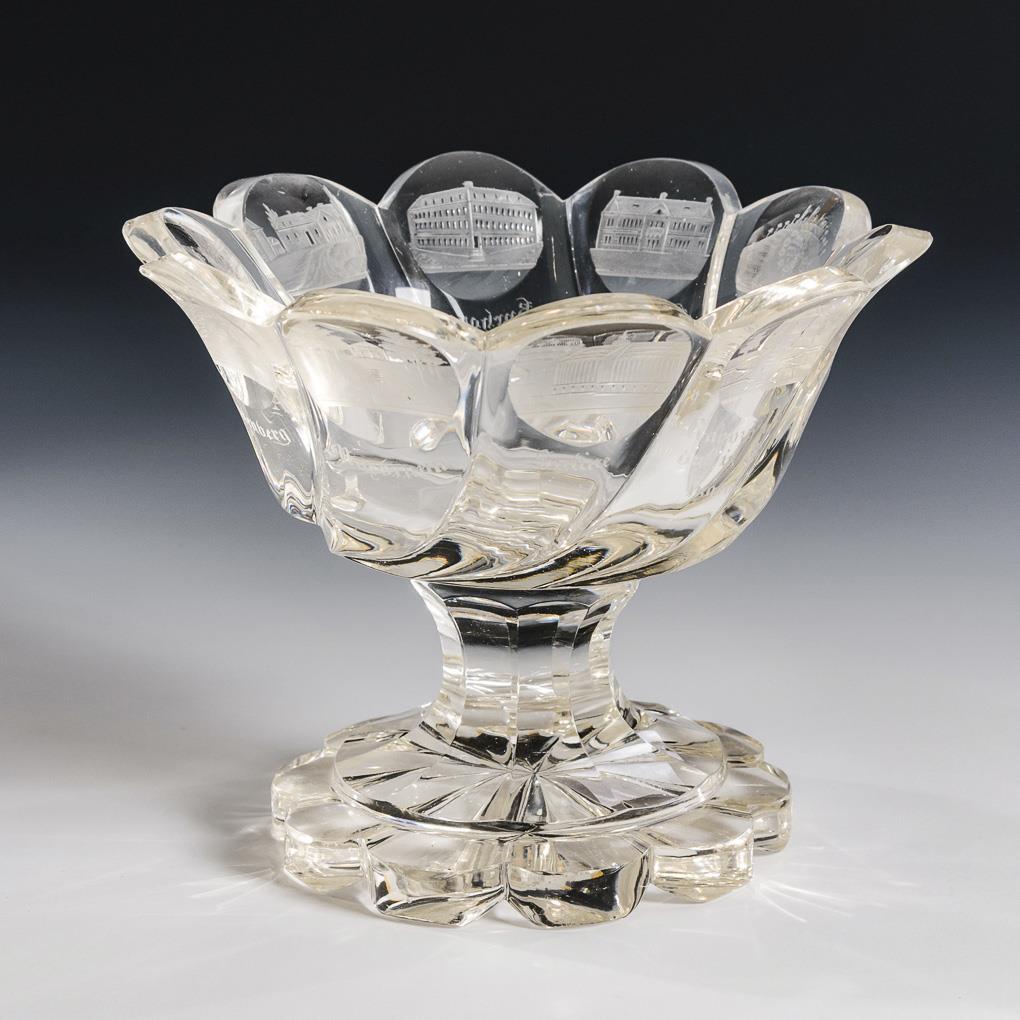 1x curved godroned footed bowl of colourless glass (h 12 cm), 1x faceted mug of colourless, red-stained glass (h 13 cm) and 1x milk jug of colourless, amber-stained glass (h 8,5 cm). All with engraved, partly blown views of Bad Kissingen. 1 bump on the rim of the bowl.