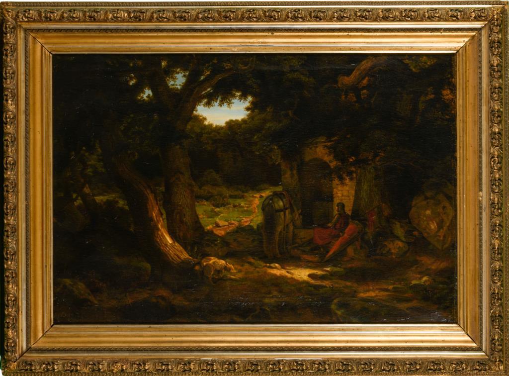 Der Ritter und das Pferd im Schatten der Bäume an einem Wasserbecken. Leichte Altersspuren.