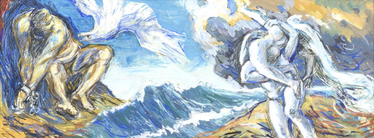 The chained Prometheus, whose liver was eaten daily by the approaching eagle, is separated by a sea trench from a group of persons, which by arrangement and pale incarnate clearly reminds of the sculpture "The Rape of Persephone" by Giovanni Lorenzo Bernini.