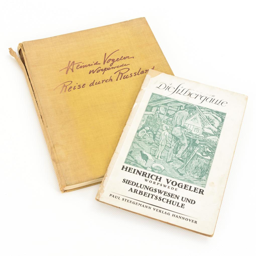 Publication - Heinrich Vogeler - Worpswede. Journey through Russia. The Birth of the New Man, Dresden [1924], with 32 drawings by the author in offset print, spine damaged, some foxing | Booklet - Heinrich Vogeler. Siedlungswesen und Arbeitsschule, Hannover 1919, from the series "Die Silbergäule", booklet cover somewhat damaged, paper browned.