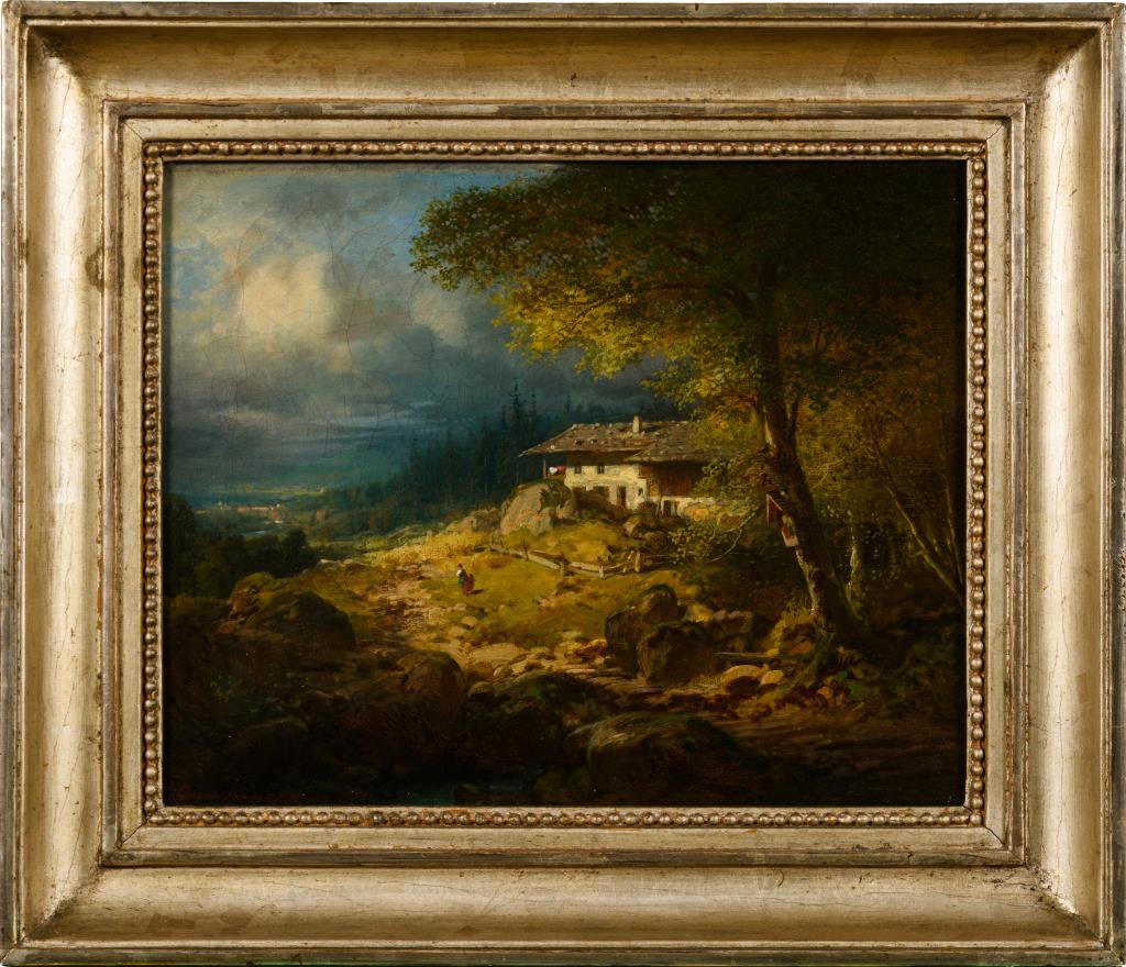 Gebirgslandschaft mit Staffage in idyllischem Lichteinfall. Altersspuren.
