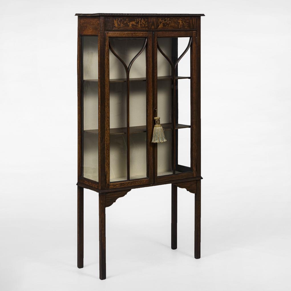 2-door display cabinet on pillar legs, glazed on 3 sides and promised with arched decorative elements, cornice decorated with knightly-heroic scene as marquetry; 2 shelves inside, back panel with cream fabric cover. Smaller repair spots, signs of age/use, somewhat warped.