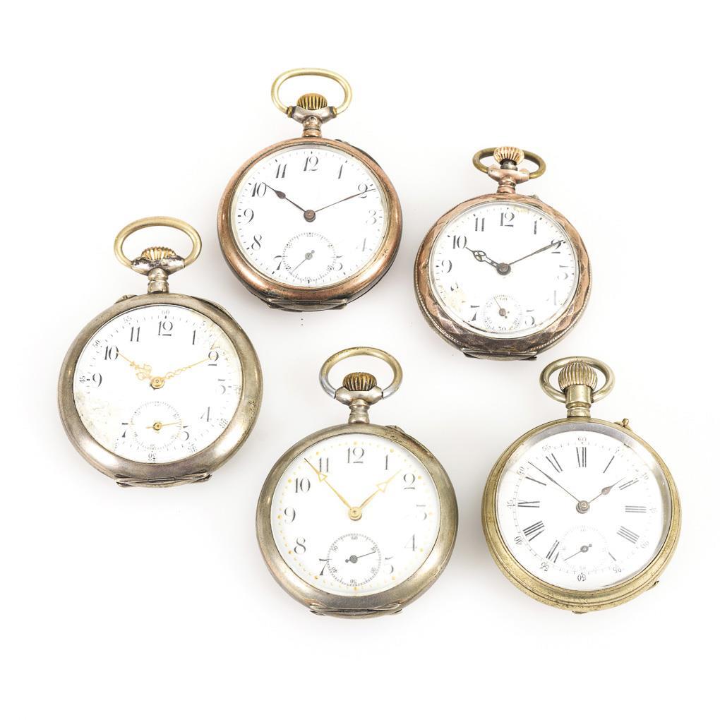 Guilloché cases, some with empty crest reserve. White dials with small seconds, predominantly Arabic numerals. Movements with 4x cylinder escapement, 1x lever escapement, partly functional. Each with defects and traces of use.