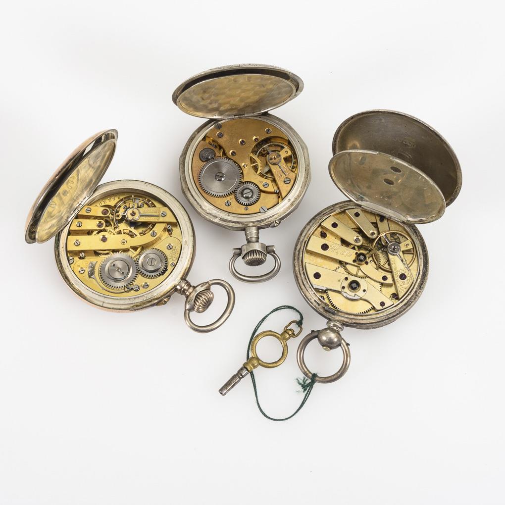 1x crescent/crown/800 silver hallmarked: Borel Fils & Cie, guilloché galonné case with empty escutcheon reserve, white enamel dial with red and black Arabic numerals, small seconds and Spade hands, BFC marked movement with lever escapement, movement number 358300, running, Ø 5.1 cm, 87 g. 2x silvered (tested): W & H, guilloché case with empty escutcheon reserve, white enamel dial with Roman numerals, small second and Louis Quinze hands, marked bridge movement with cylinder escapement and key winding, with key, runs short, Ø 4,9 cm. Unmarked, floral relief case, white enamel dial with red and black Arabic numerals, marked "Montre de Précision", small seconds and floral hands, unmarked movement with anchor escapement, running, Ø 4,8 cm. Partially fine hairline cracks, slight signs of wear.