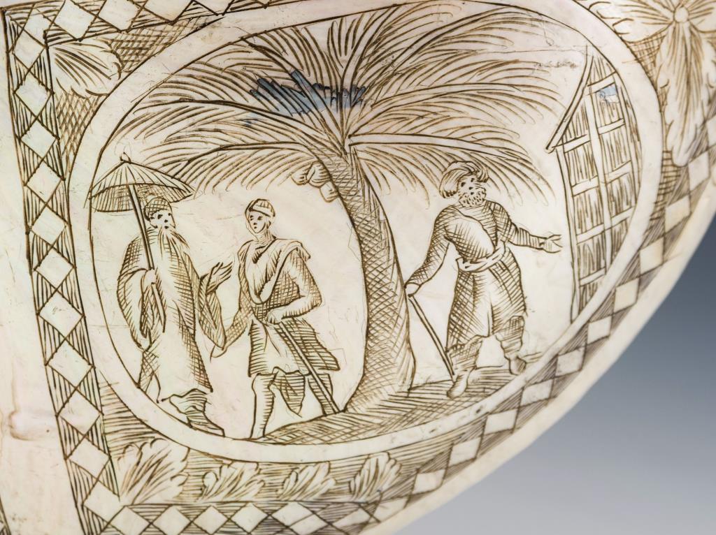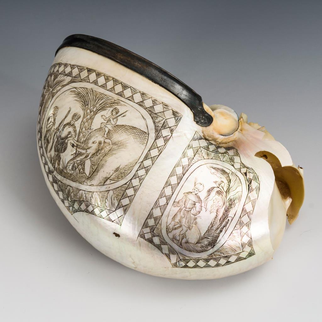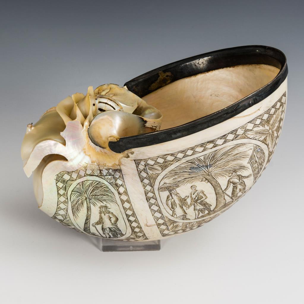 Perlboot-Gehäuse teilweise geöffnet und teils in Form eines Ritterhelmes gearbeitet sowie mit Montierung wohl aus niedrig legiertem Silber. Beidseitig exotische Gravuren. Defekte am Gehäuse.
