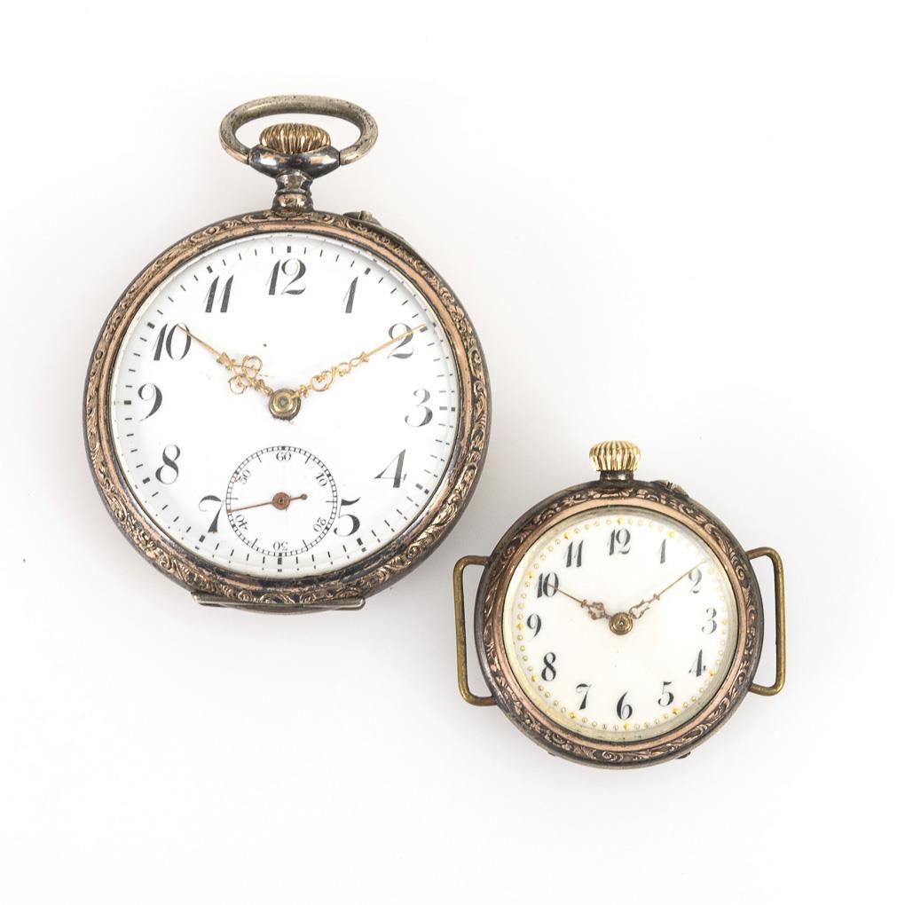 Each lépine case with guilloché back cover and blank escutcheon reserve, floral relief frame, white enamel dials with Arabic numerals, 1x small seconds. Unmarked movements with cylinder escapement. 1x Mariage ladies' watch, without bracelet, running, Ø 3,3 cm, 26 g. 1x Pocket watch, not running, Ø 4.6 cm, 66 g. Slight signs of age and wear, large dial somewhat hairline cracked, small crown added.