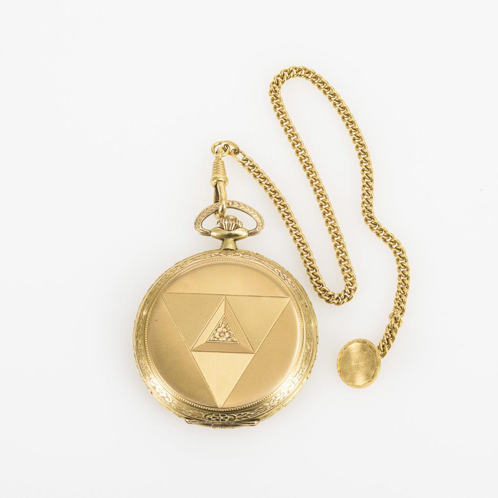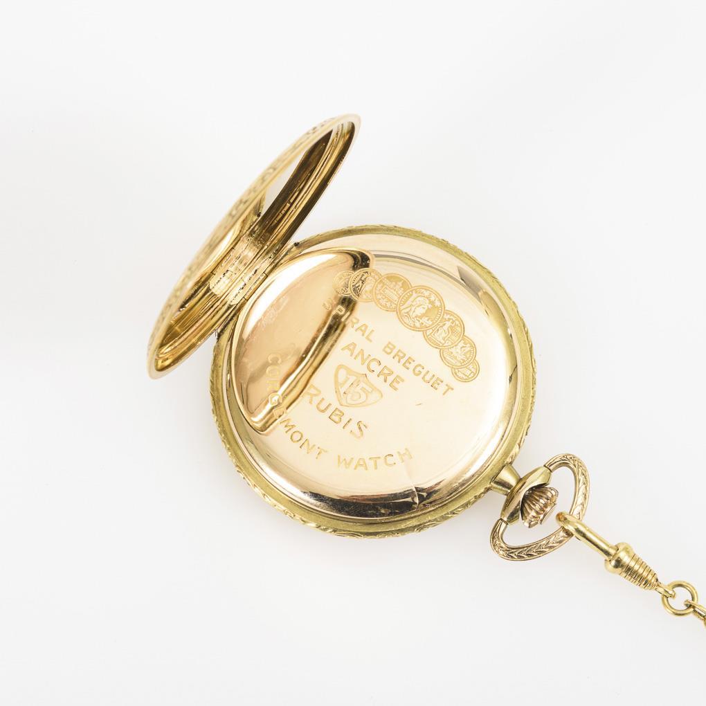 Golden Savonnette on gilt watch chain. Chronomètre Corgémont Watch.