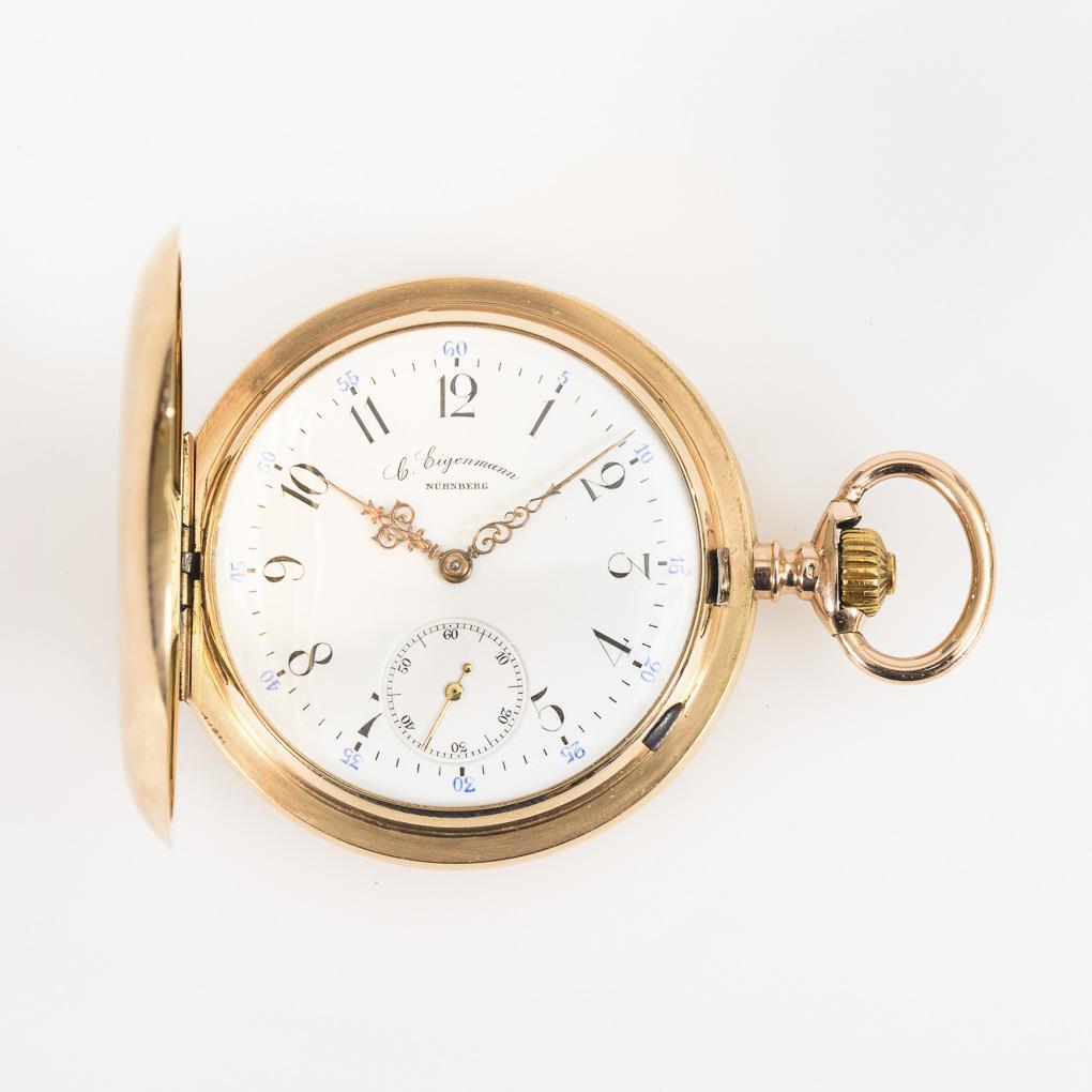 "C. Eigenmann Nuremberg" engraved and "DB" marked three-quarter plate movement with lever escapement, blued Breguet hairspring, screw compensated balance, screwed chatons, crown winding, running. White enamel dial with blue and black Arabic numerals, minute crown, small seconds and Louis Quinze hands, marked "C. Eigenmann Nürnberg".
