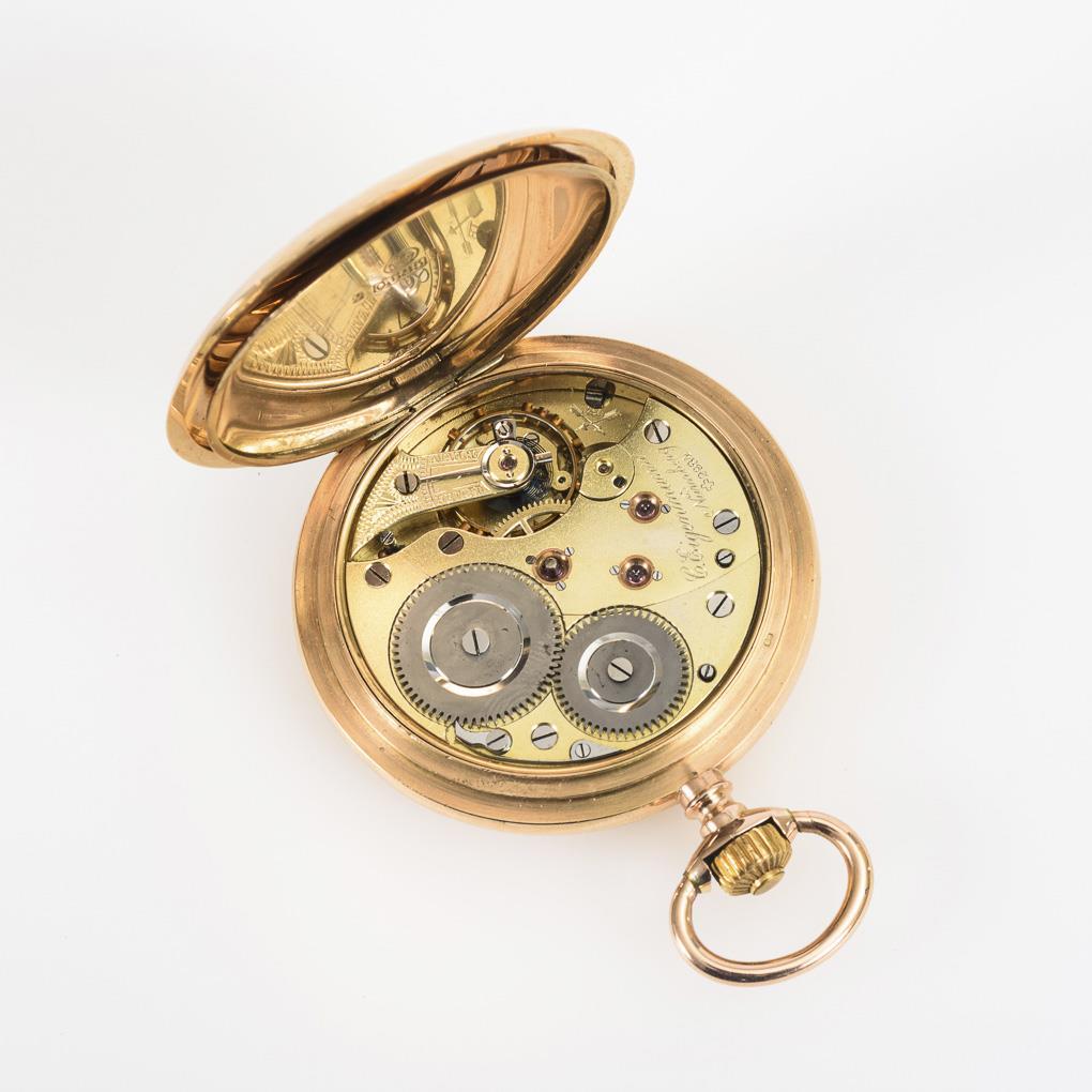 585 hallmarked, Swiss hallmark, hallmark of fineness, Philippe Dubois & Fils company mark, gold dust cover. Ø 5.3 cm. 111 g.