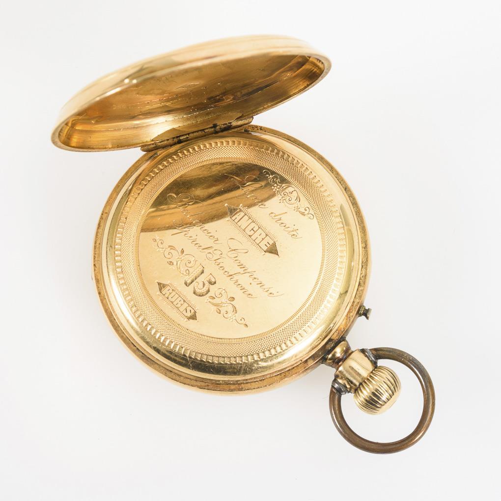 Lépine case with guilloché back cover and engraved rosette ornament. Case dented and partly rubbed, hand position in need of revision.