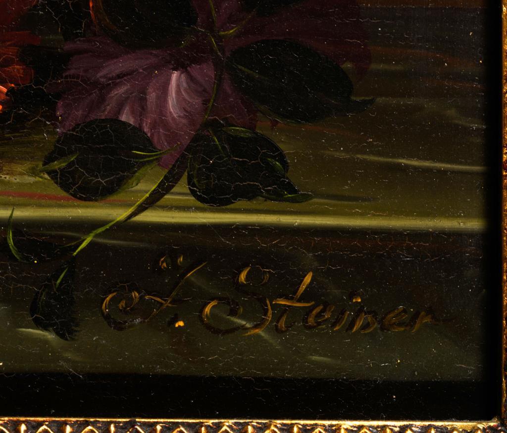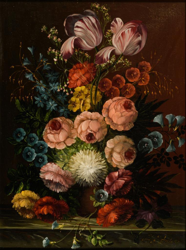 Üppiger Blumenstrauß in kleiner Vase auf einem Marmorsims. Minimale Altersspuren.